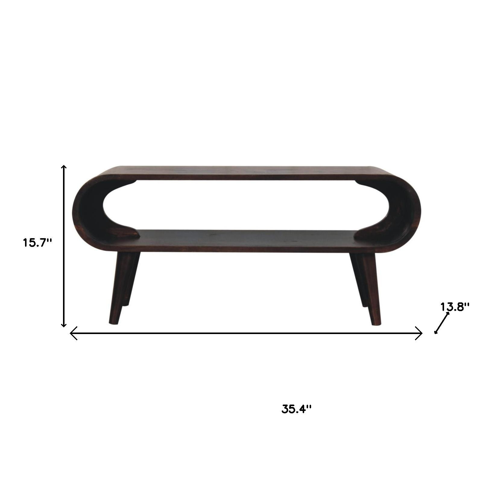 Make your living room or family room really stand out with this 35-inch walnut solid wood coffee table with shelf. This table features quality construction from solid wood and an updated monotone color scheme with walnut as the main color on both the top and the base. Help to keep your space organized with the included single shelf. This rectangular table is an classic yet updated way to accent your room. It has an attractive design that will definitely breathe some fresh air into your interior. 15.70-inch h x 35.40-inch w x 13.80-inch d.