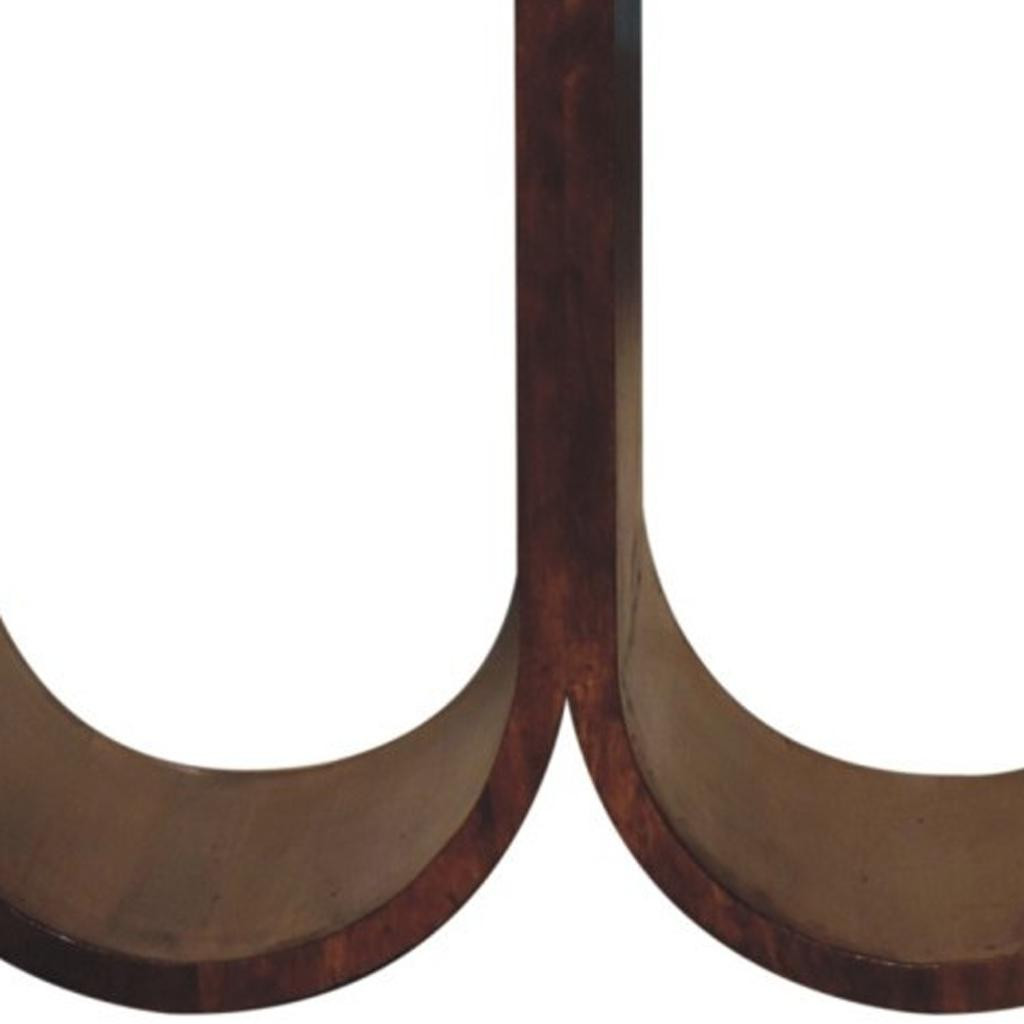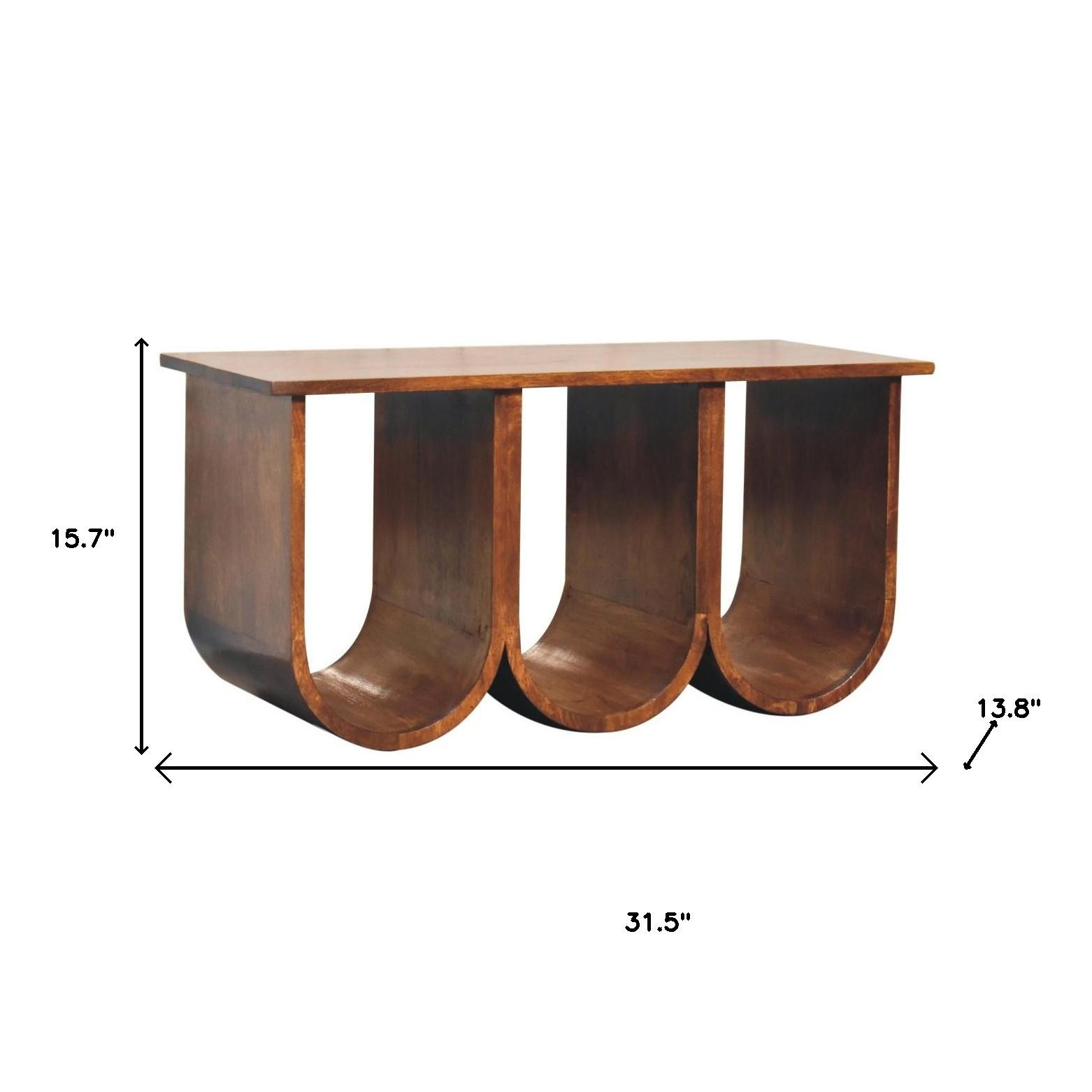 Give your living room, family room, or office the perfect anchor piece with this 32-inch chestnut solid wood abstract coffee table with three shelves. This table is made from solid wood in a chestnut color throughout the base and top. Includes 3 shelves for additional storage or display space. This classic rectangular table will be a great accent in any room if you're looking for something that can fit into a living area, bedroom, or office, this coffee table is for you. 15.70-inch h x 31.50-inch w x 13.80-inch d.