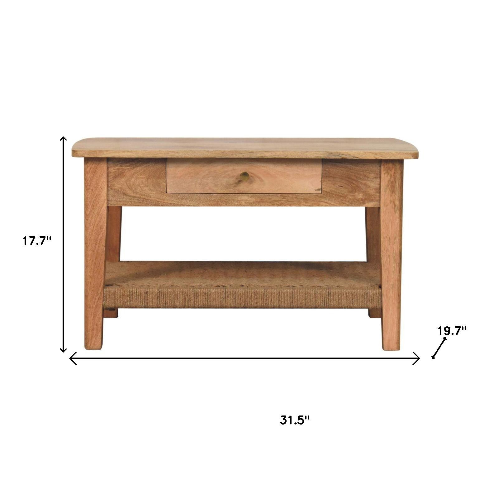 This stylish 32-inch oak solid wood floor shelf coffee table with drawer and shelf is sure to inspire compliments no matter where it sits. This table is made from solid wood in a oak color throughout the base and top. Help to keep your space organized with the included single shelf. This rectangular table is an classic yet updated way to accent your room. If you're looking for something that can fit into a living area, bedroom, or office, this coffee table is for you. 17.70-inch h x 31.50-inch w x 19.70-inch d.