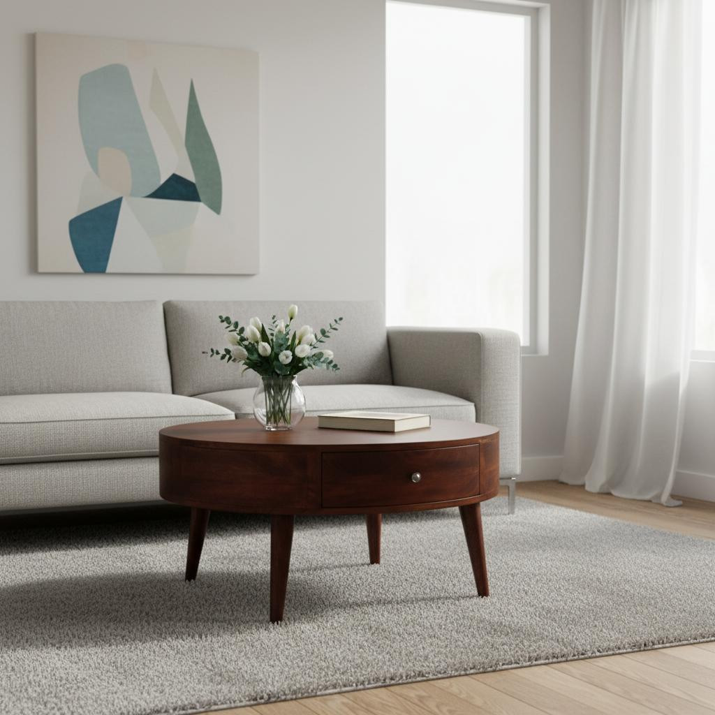 This stylish 32-inch chestnut solid wood round coffee table with two drawers is not only practical, but good looking and built to last. This table is made from solid wood in a chestnut color throughout the base and top. If you're looking for something that can fit into a living area, bedroom, or office, this coffee table is for you. 15.70-inch h x 31.50-inch w x 31.50-inch d.