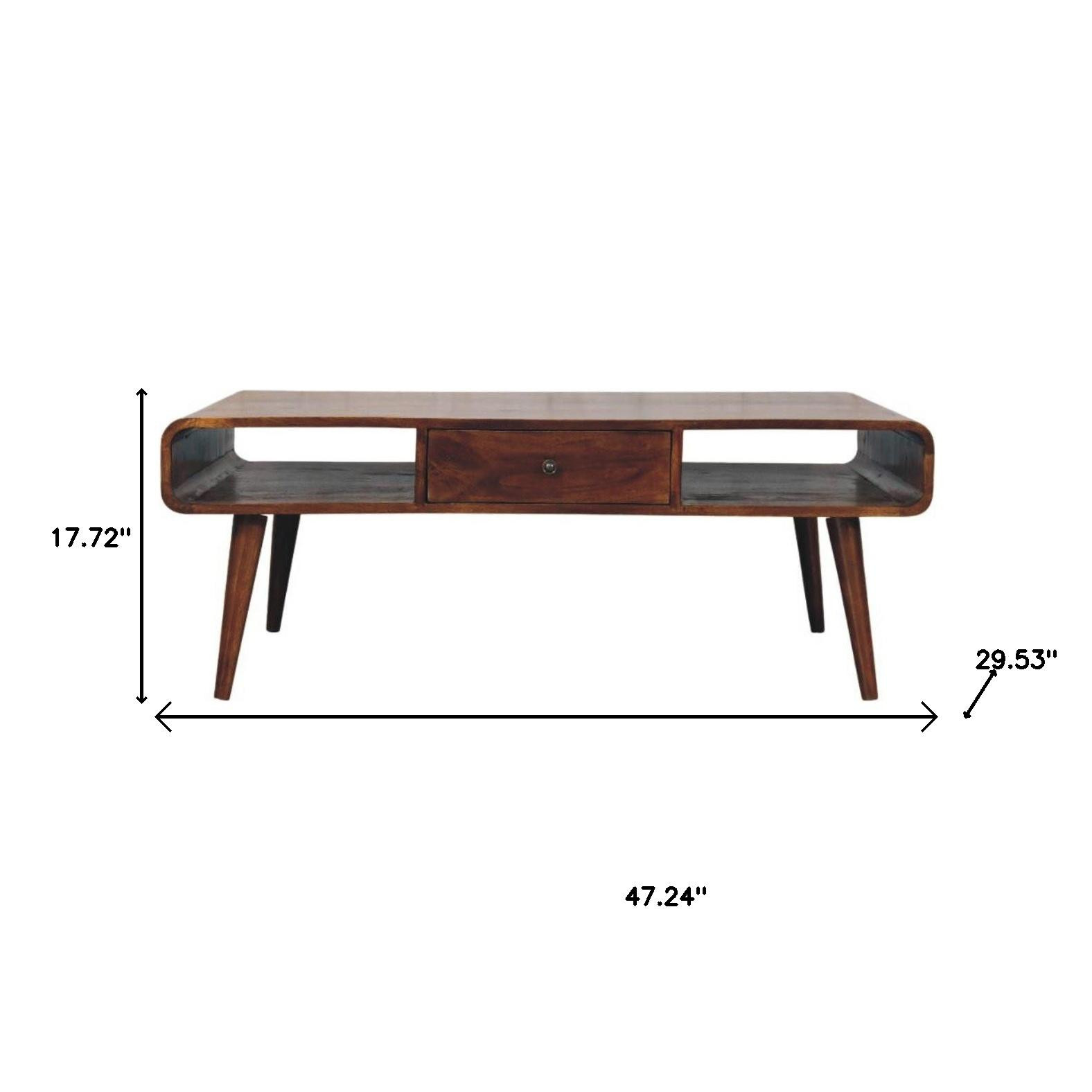 This stylish 47-inch chestnut solid wood coffee table with two drawers and two shelves is sure to inspire compliments no matter where it sits. Made of solid wood, the chestnut coloration throughout gives this piece an updated and refreshing look. Includes 2 shelves for additional storage or display space. This rectangular table is an classic yet updated way to accent your room. It has an attractive design that will definitely breathe some fresh air into your interior. 17.72-inch h x 47.24-inch w x 29.53-inch d.