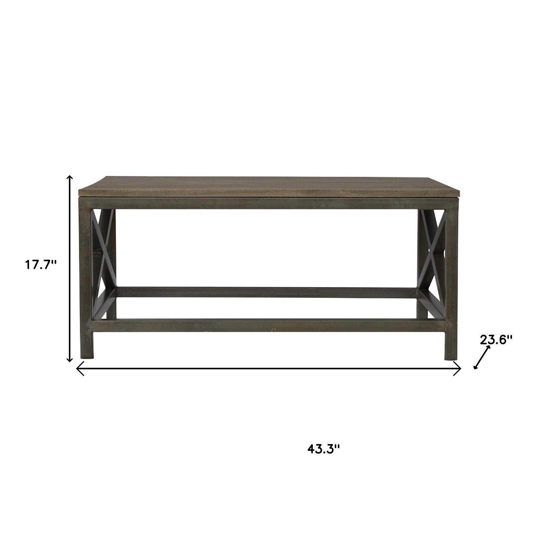 Make your living room or family room really stand out with this 43-inch natural and black solid wood and iron coffee table. A black iron frame is finished off with a natural solid wood top that is the epitome of quality construction and design. This rectangular table is an classic yet updated way to accent your room. If you're looking for something that can fit into a living area, bedroom, or office, this coffee table is for you. 17.70-inch h x 43.30-inch w x 23.60-inch d.