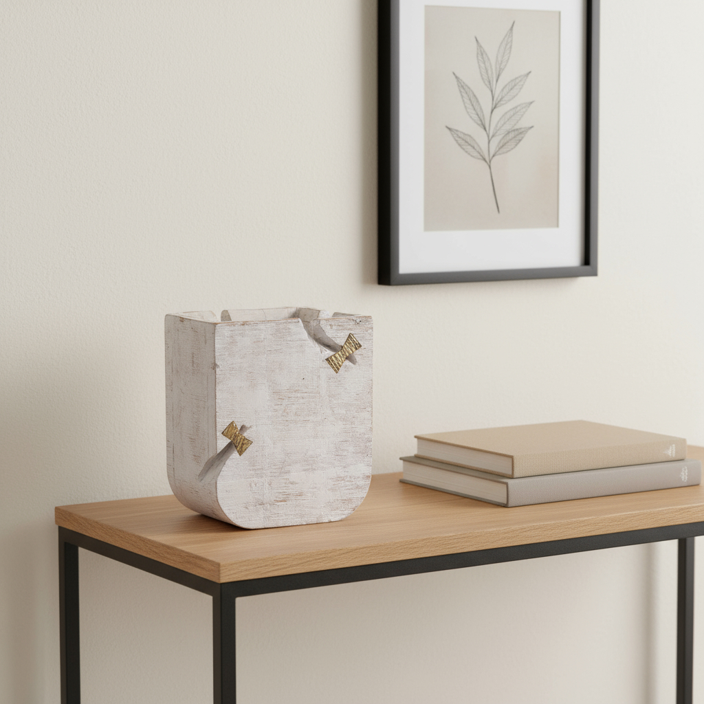 The white wood pot planter adds a touch of elegance to any indoor space. Crafted from high-quality wood, this planter is designed to enhance the beauty of your favorite plants. Its pristine white finish allows it to blend seamlessly with various decor styles, making it a versatile choice for any room. The pot planter type ensures that it provides ample space for your plants to thrive while maintaining a stylish appearance. Perfect for displaying succulents, herbs, or small flowers, this planter is both functional and aesthetically pleasing. Elevate your home decor with this charming piece that brings nature indoors and complements your living environment beautifully. 14.00-inch h x 12.00-inch w x 7.00-inch d.