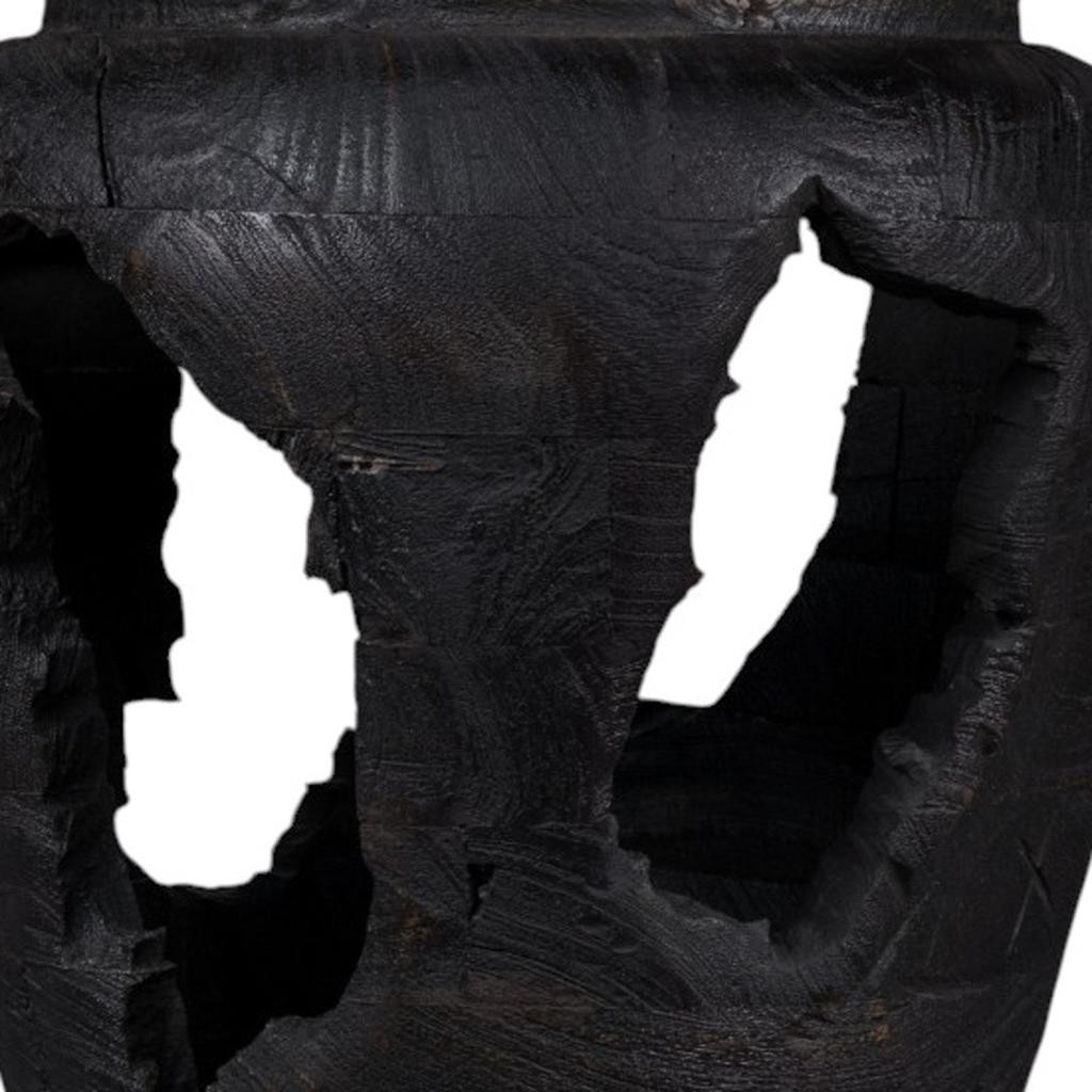 This 18-inch black solid wood modern abstract table vase with sculptural details is the perfect accent for your living room, bedroom, dining room, or lounge. Its unique wood scoring adds character and a touch of artistry to the piece, bringing warmth to any environment. Hand-painted finishes enhance the visual appeal and ensure each vase is one-of-a-kind. Crafted from high-quality solid wood, this vase exemplifies durability while serving as a stunning decorative statement. Suitable for various settings, it effortlessly complements both contemporary and traditional styles, making it an essential addition to your home decor collection. 18.00-inch h x 14.50-inch w x 14.50-inch d.