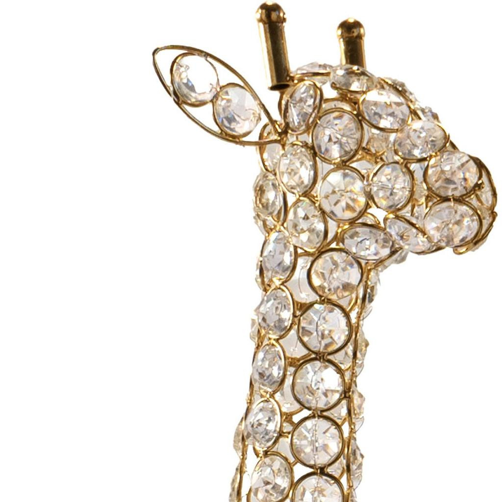 This 23-inch gold aluminum and faux crystal giraffe tabletop sculpture will add a beautiful decorative accent to your decor. Update your room in style with this fabulous safari animal decor. This stately giraffe brings some high fashion and design to your space as the gold frame is adorned with lots of faux crystal bling. It's a perfect addition for those who love an up-to-the-minute look and feel. 23.00-inch h x 12.50-inch w x 5.50-inch d.