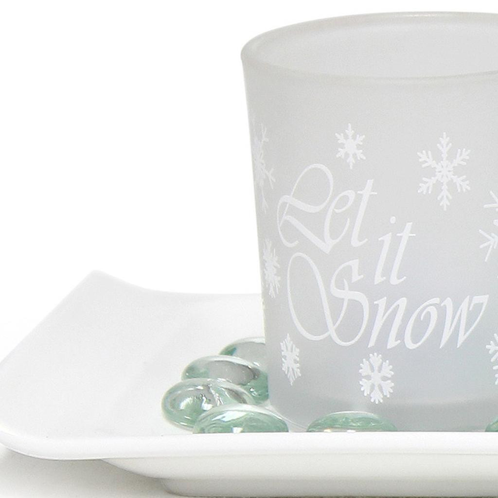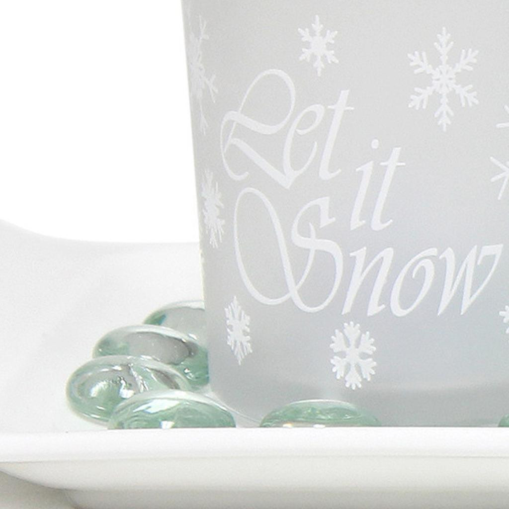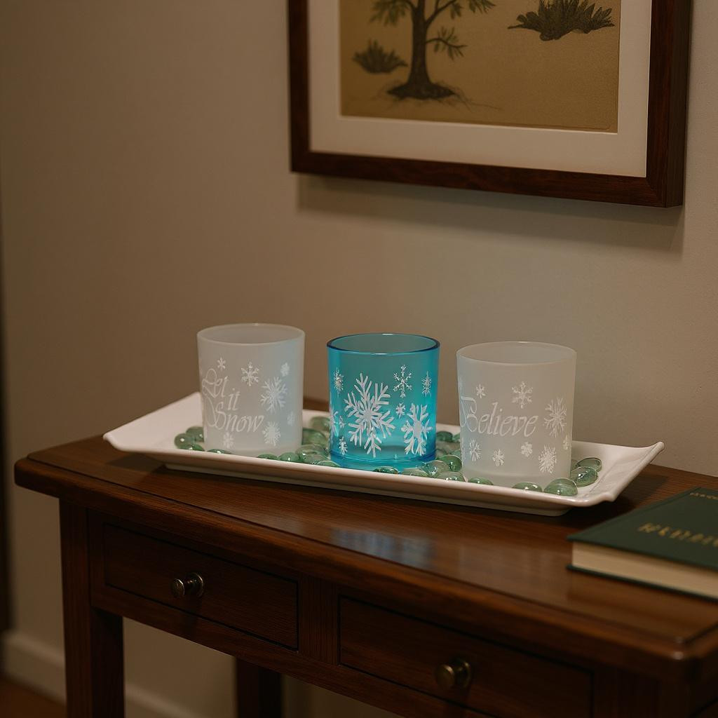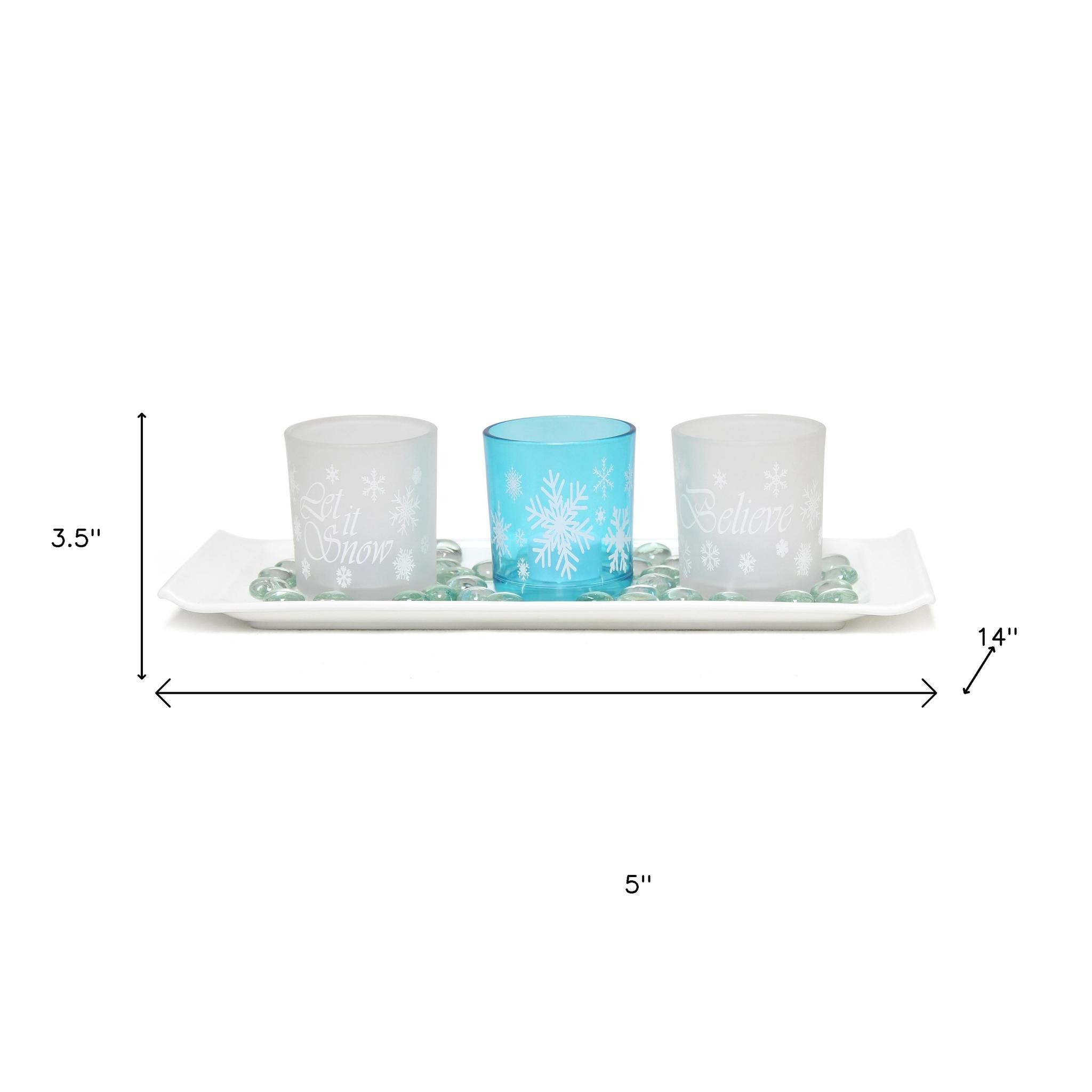 This 4-inch blue snowflake glass tabletop tealight will bring warm candlelight and your favorite fragrance to any space. Sold as a set of 3, this candleholder makes both the perfect gift and functional, decorative accent. This candleholder is the perfect illuminating design to accent your space in style. Candleholders are a decorative accent on their own, with or without candles. 14.00-inch h x 5.00-inch w x 3.50-inch d.