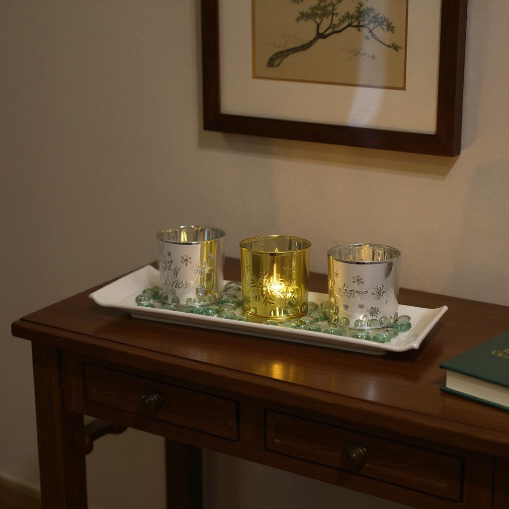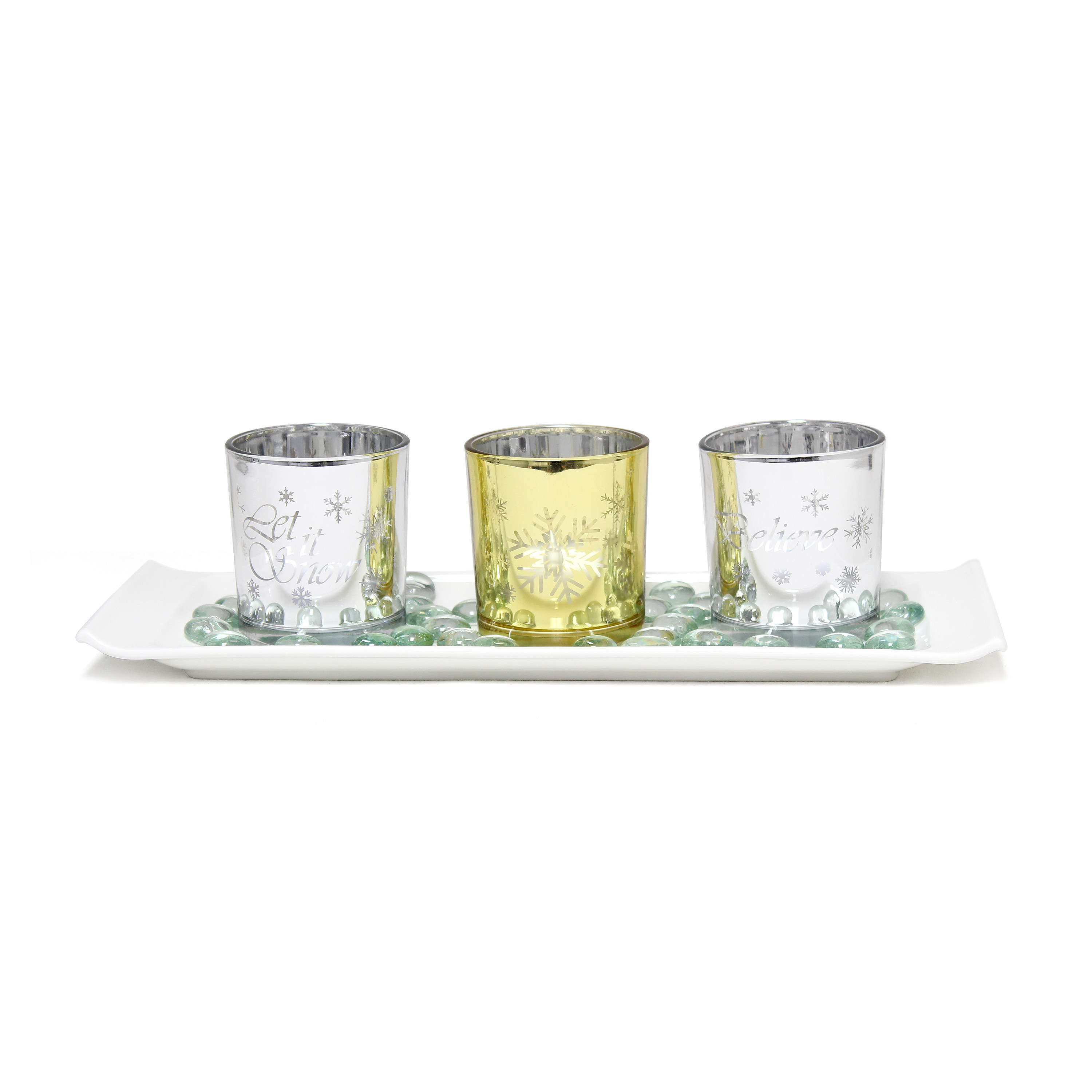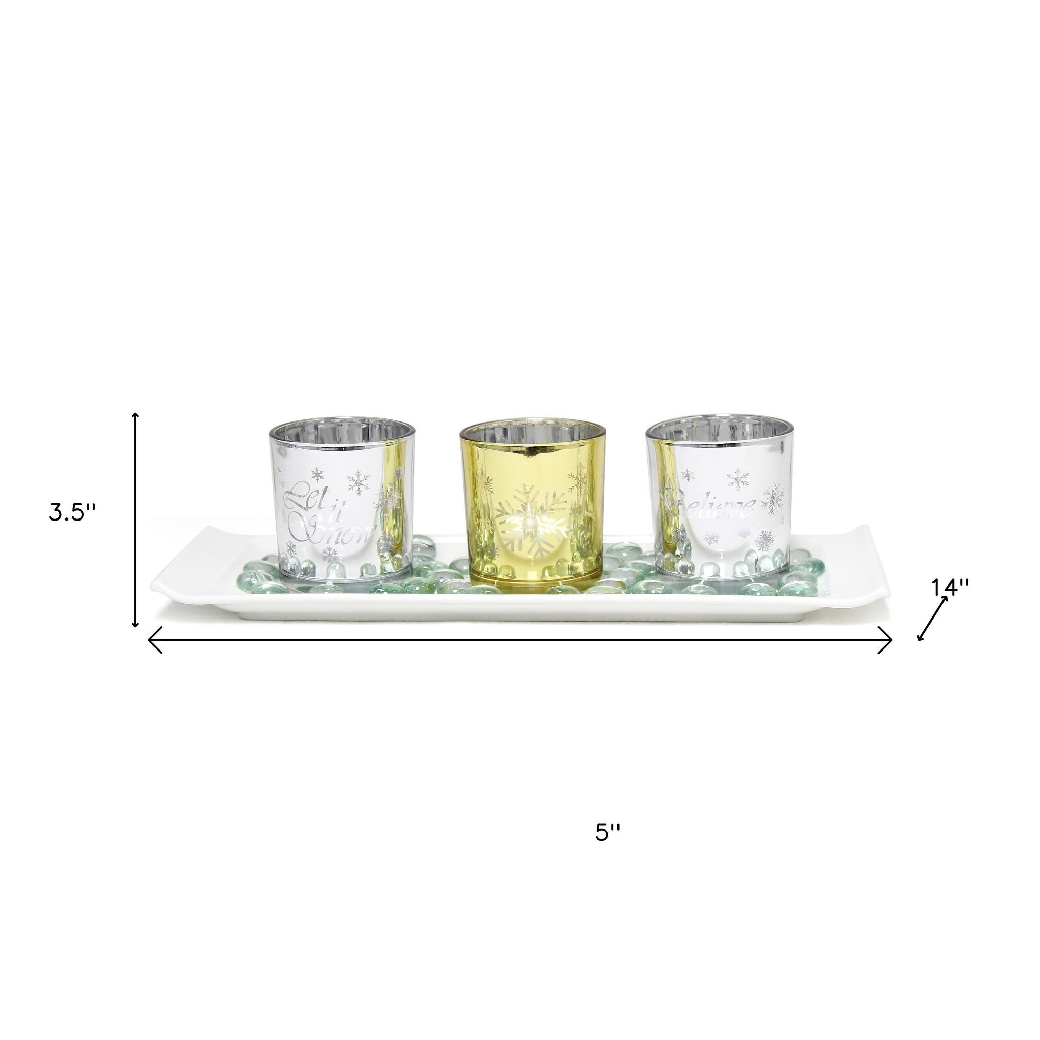 This 4-inch gold snowflake glass tabletop tealight will bring warm candlelight and your favorite fragrance to any space. Arriving in a set of 3 these candleholders create a well-lit centerpiece for any table setting. Add an extra pop of personality to every corner of your home with this gorgeous candleholder candleholders are a decorative accent on their own, with or without candles. 14.00-inch h x 5.00-inch w x 3.50-inch d.