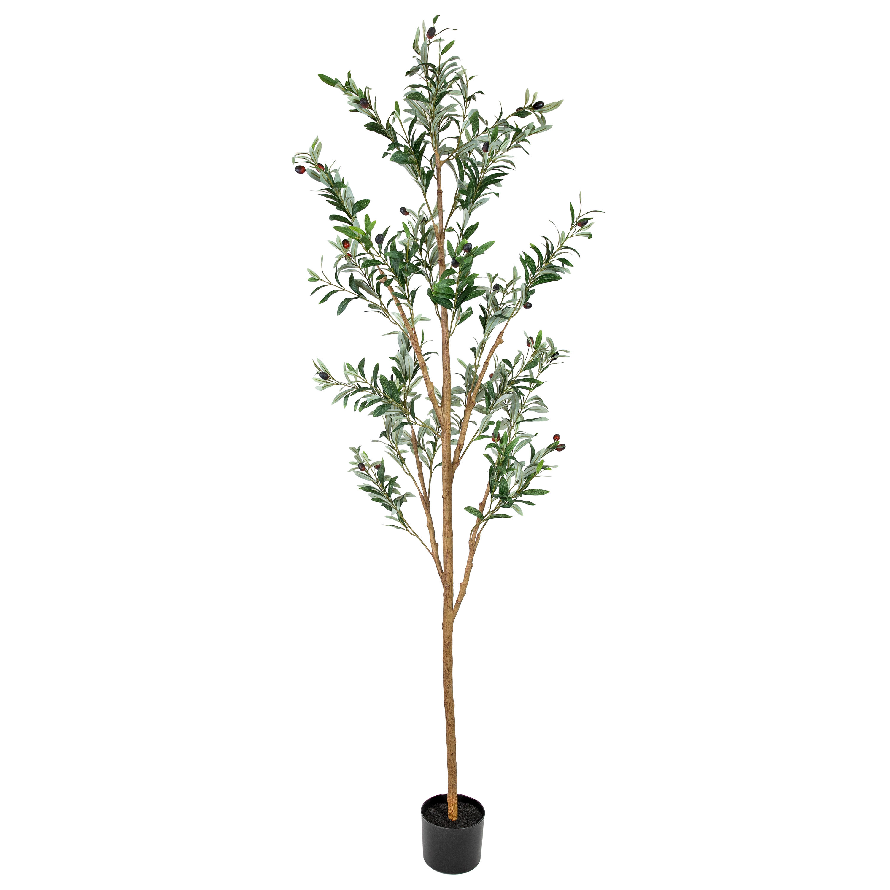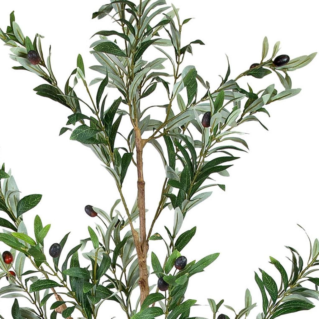 The 84-inch green olive artificial tree in a black pot brings a touch of nature indoors with its lifelike appearance. Designed for floor placement, it serves as an eye-catching centerpiece in any room. The included black pot adds a modern touch, perfectly complementing the rich green foliage. This ornamental tree with adjutable branches is ideal for those seeking the beauty of greenery without the upkeep of real plants. Enjoy the elegance and charm of an olive tree without the worries of watering or sunlight, making it a practical addition to your home decor. 84.00-inch h x 26.00-inch w x 26.00-inch d.