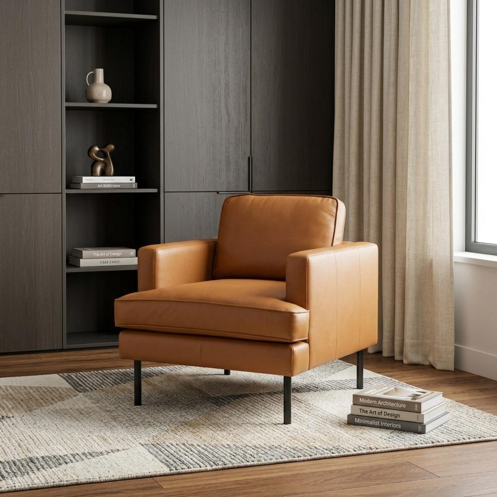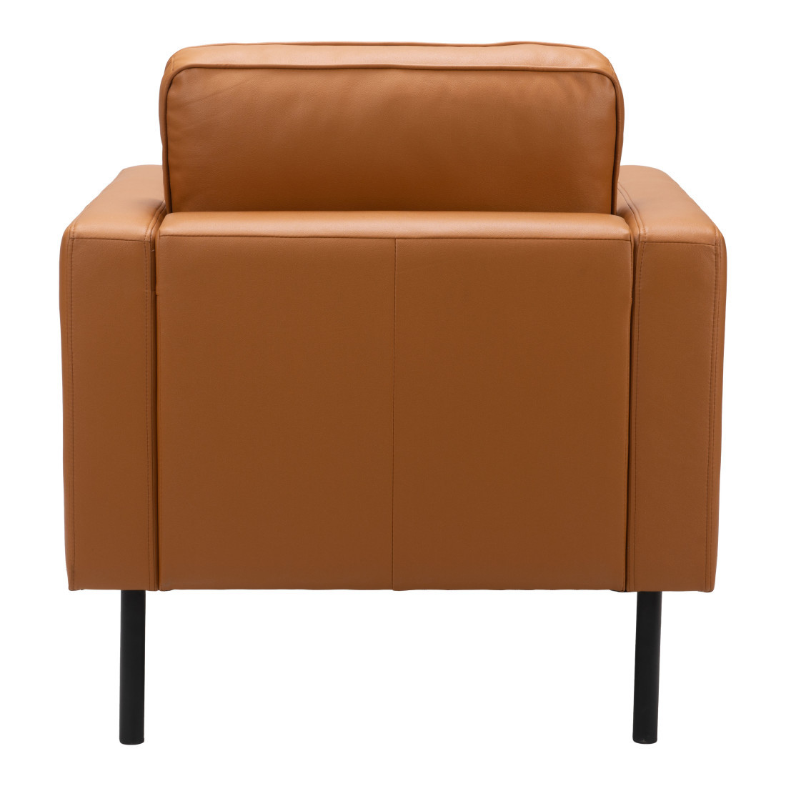 Stylish, elegant and fully functional, the 33-inch brown faux leather upholstered arm chair adds a touch of panache to any set up. Built to last, this arm chair is finished in a super durable and hearty caramel brown vinyl faux leather to give your room a great update. The sturdy inner frame is built with high quality manufactured wood, while the legs are made of sturdy black powder coated steel. This good looking and practical chair includes armrests, and features a cushioned back and seat that will look good in your space. 32.30-inch h x 33.00-inch w x 37.00-inch d.