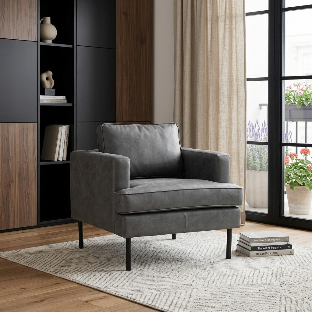 Add an air of fashion to your room and rejuvenate the space with this 33-inch gray upholstered arm chair. Built to last this arm chair is finished in solid gray 100% polyester to give your room a great update. Giving the chair stability and structure, the inner frame is constructed with high quality manufactured wood, includes comfy armrests, and features a cushion back that comes complete with soft and comfortable cushioning. 32.30-inch h x 33.00-inch w x 37.00-inch d.