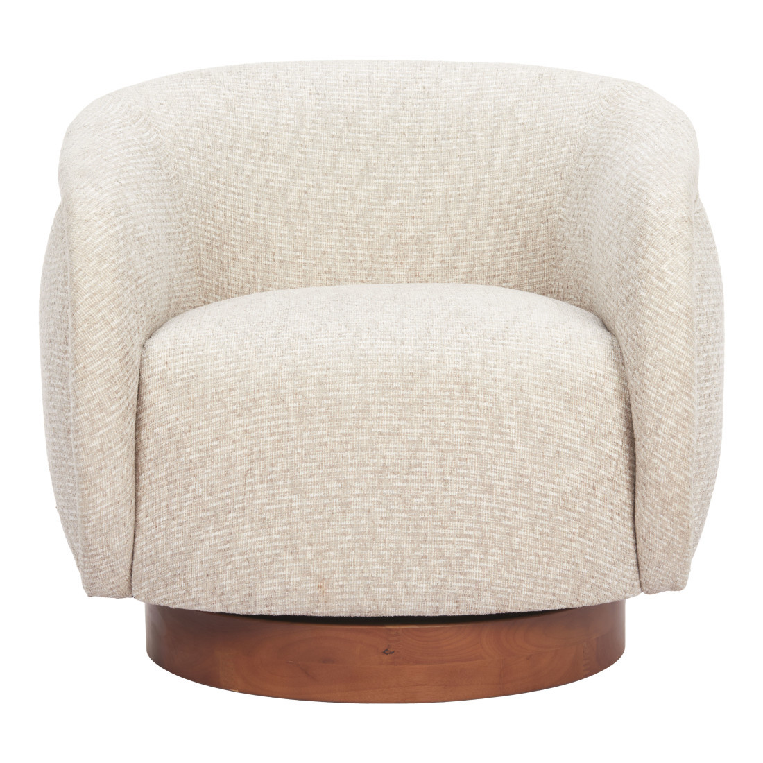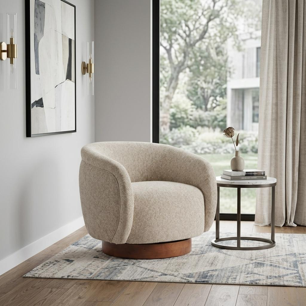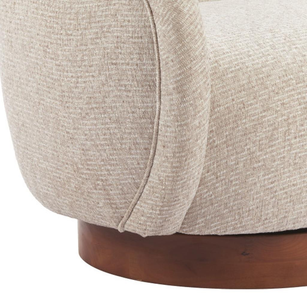 Stylish, elegant and fully functional, the 36-inch beige upholstered swivel arm chair adds a touch of panache to any set up. This gorgeous solid color beige arm chair is masterfully upholstered in durable 100% polyester. The sturdy inner frame and base is built with a mix of solid and manufactured woods, includes armrests, and features a tight curved back that is accented with soft and comfortable cushioning. A swivel feature allows this chair to turn, adding versatility to your seating. 31.10-inch h x 36.00-inch w x 34.00-inch d.