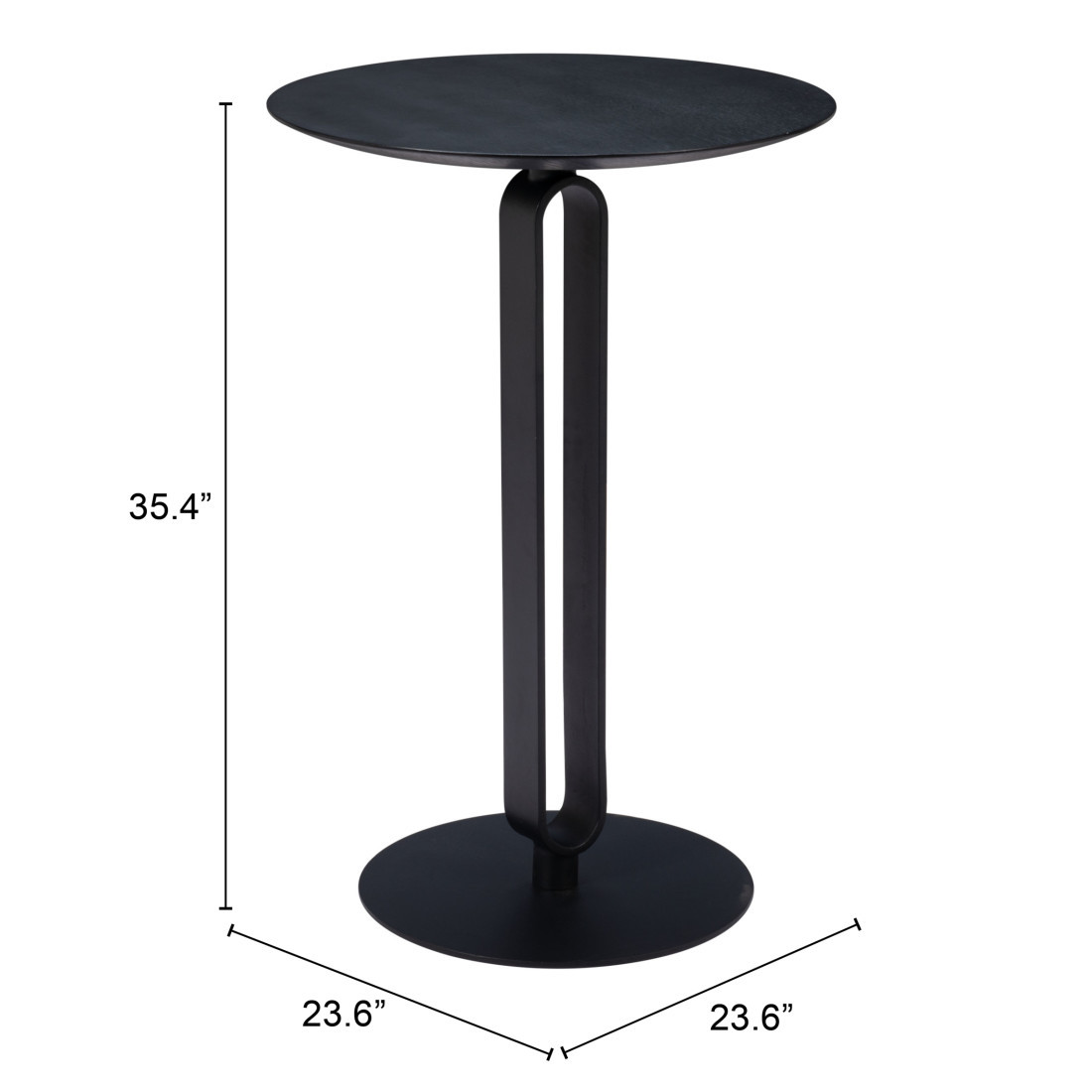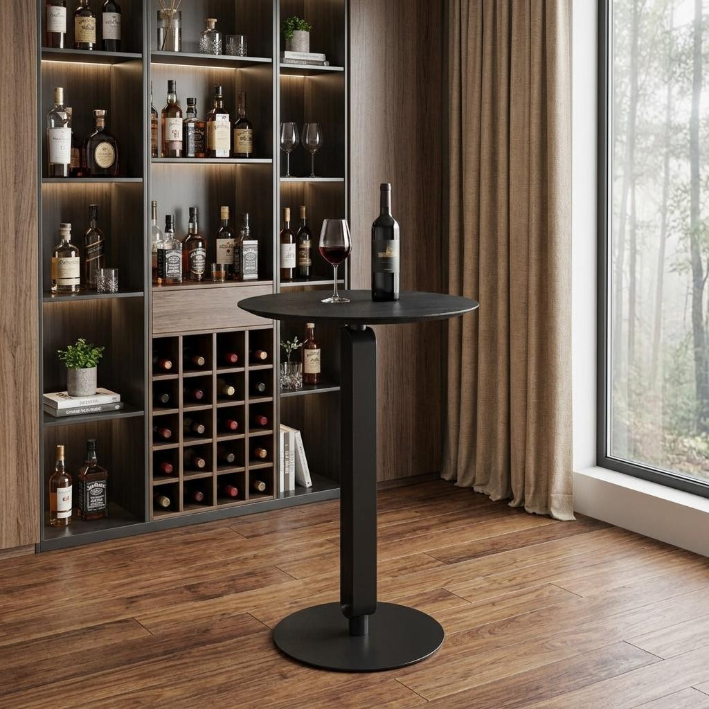 The 24-inch black wood and steel rounded bar table combines modern aesthetics with functional design. Its round shape offers a sleek profile, making it perfect for intimate gatherings or casual dining experiences. The top is crafted from manufactured wood, providing a smooth surface ideal for drinks and appetizers. A sturdy steel base ensures durability while adding a contemporary touch. Both the table top and base are finished in a striking black, enhancing its stylish appeal. This table features a fixed mechanism, providing stability for daily use. With a pedestal base type, it's designed to save space while allowing ample legroom. The machine-made construction guarantees consistent quality for long-lasting enjoyment in any setting. 35.40-inch h x 24.00-inch w x 24.00-inch d.