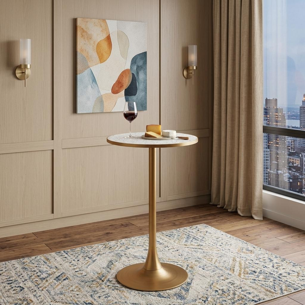 The 24-inch beige and gold faux terrazzo and steel rounded bar table is a stunning addition to any modern space. Designed with a round shape, it seamlessly fits into diverse layouts while offering both style and functionality. The top is crafted from high-quality faux terrazzo, providing a chic look that catches the eye. Its gold pedestal base not only enhances stability but also adds a touch of elegance to your decor. Built with a fixed mechanism, this table ensures durability and ease of use. The machine-made construction guarantees attention to detail, making it a reliable choice for both bar and restaurant settings. Elevate your dining experience with this stylish and sophisticated piece. 41.70-inch h x 24.00-inch w x 24.00-inch d.