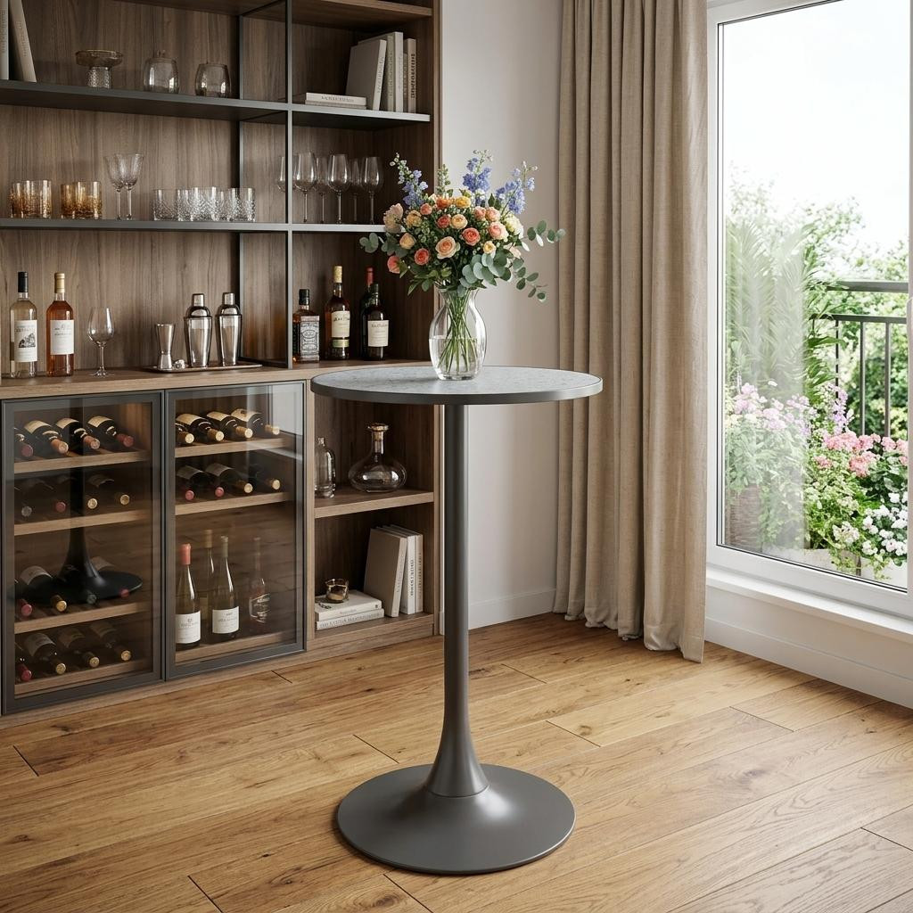 The 24-inch gray and black faux terrazzo and steel rounded bar table seamlessly blends modern style with functionality. Its round shape offers a sleek design that fits perfectly in any bar or restaurant setting. Crafted from durable faux terrazzo, the top showcases a stunning gray hue that adds sophistication. The robust steel base in striking black provides stability and support, enhancing its overall aesthetic appeal. With a fixed table mechanism, this piece ensures reliable use while maintaining its elegant look. The pedestal base type offers easy access around the table, making it an ideal choice for both casual and formal dining experiences. Enjoy the impeccable craftsmanship of this machine-made table as it elevates your space. 41.70-inch h x 24.00-inch w x 24.00-inch d.