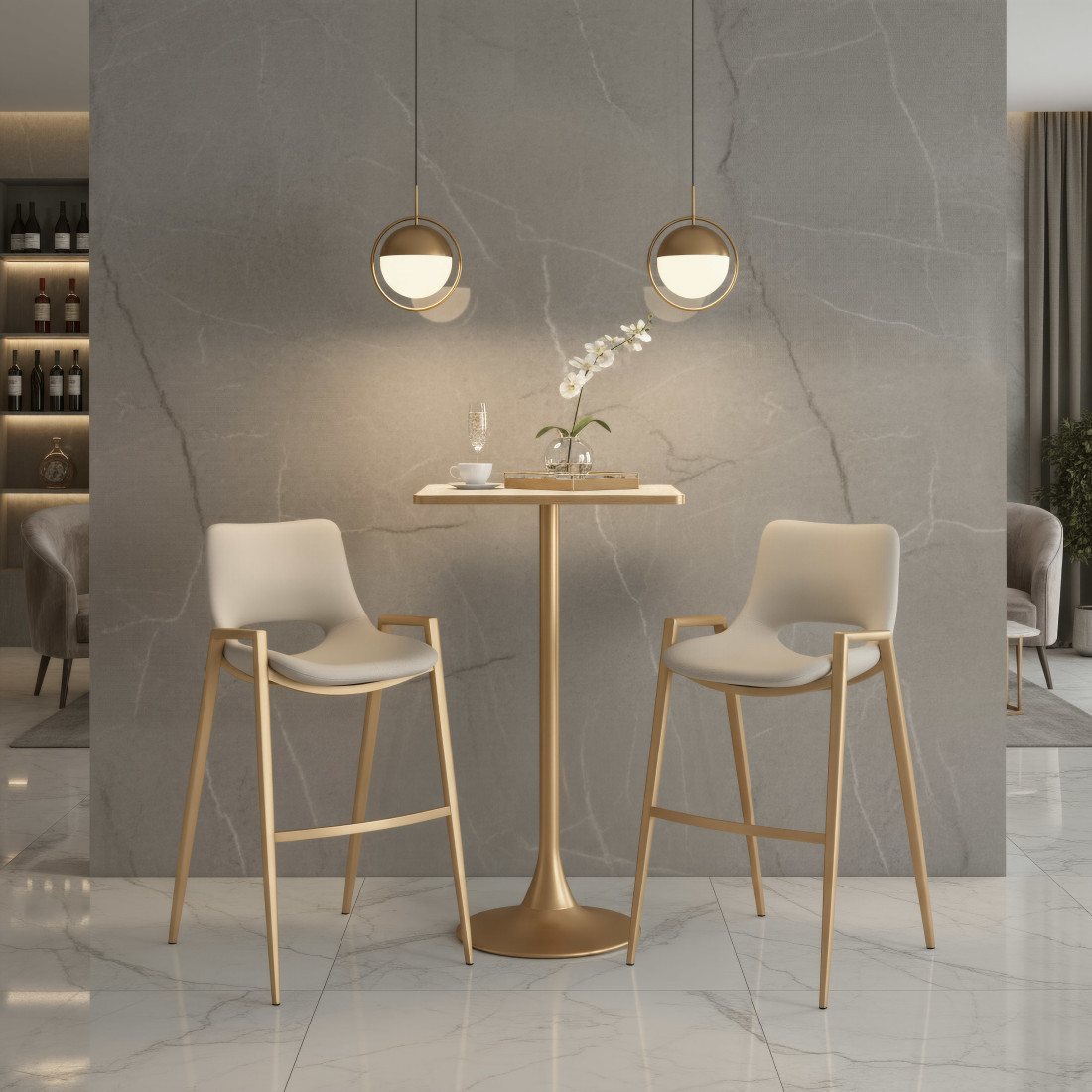 The 24-inch beige and gold faux terrazzo and steel square bar table is a striking addition to any bar or restaurant setting. Featuring a modern design, this elegant table showcases a square top crafted from exquisite faux terrazzo in a soft beige hue. The sturdy base is made of durable steel, finished in a luxurious gold color that adds a touch of sophistication. Its fixed table mechanism ensures stability for any dining experience, while the pedestal base type provides ample legroom. Constructed with precision through machine-made processes, this table guarantees both style and functionality, making it an ideal choice for contemporary decor. Elevate your space with this eye-catching and versatile piece of furniture. 41.70-inch h x 24.00-inch w x 24.00-inch d.