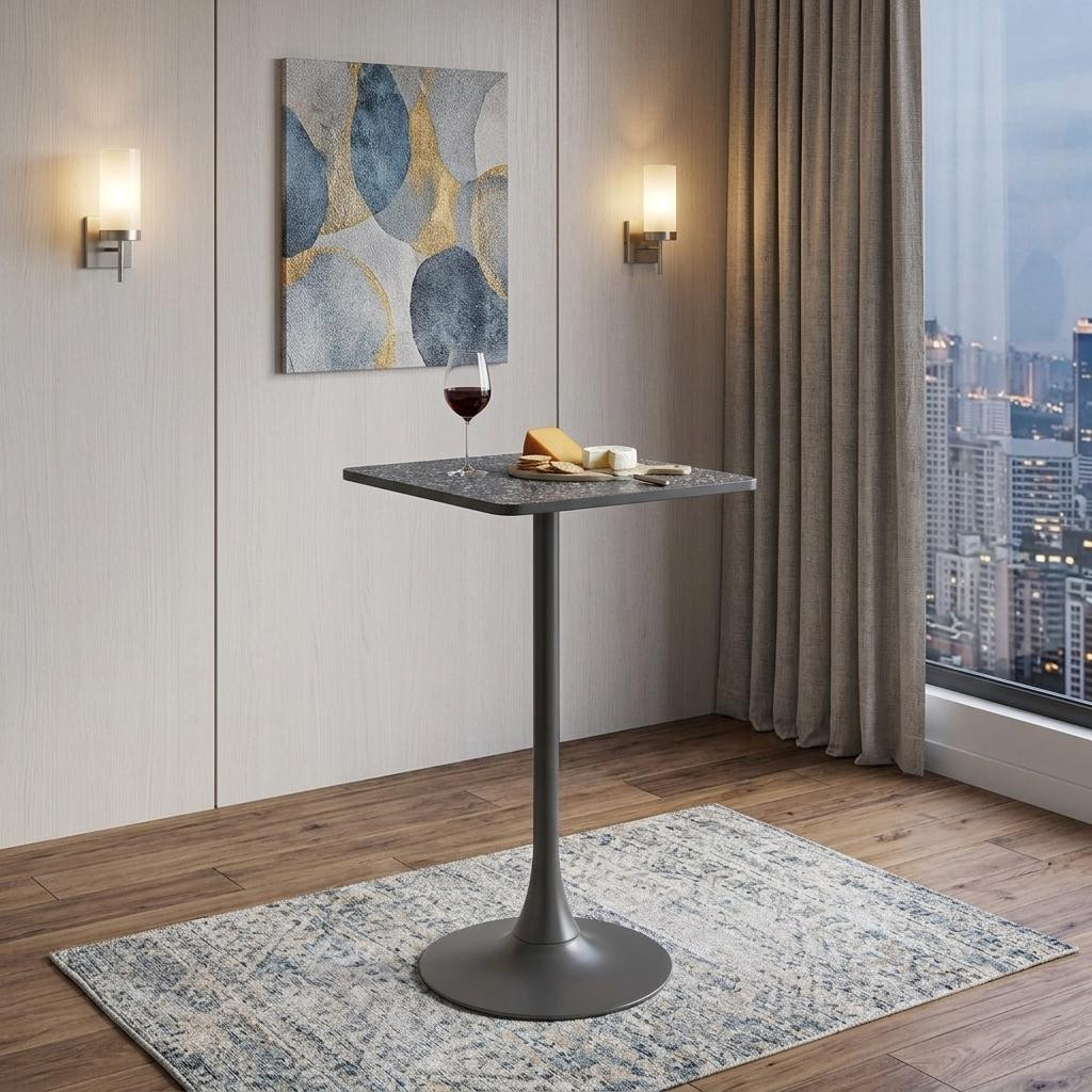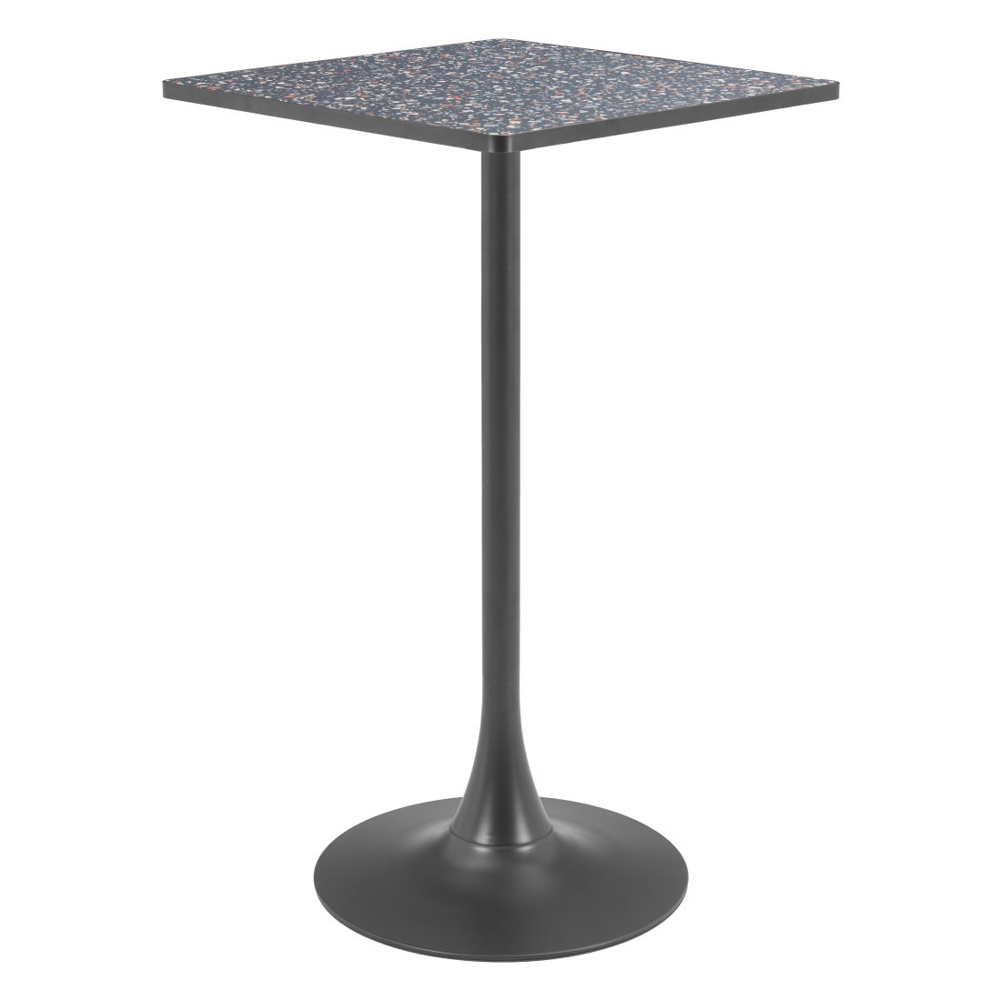The 24-inch black faux terrazzo and steel square bar table is a stylish addition to any contemporary setting. Its sleek square shape complements various decor styles, while the striking black faux terrazzo top offers a sophisticated touch. Supported by a sturdy black steel pedestal base, this table ensures stability and durability for everyday use. The fixed table mechanism contributes to its robust design, making it ideal for both casual dining and social gatherings. With its machine-made construction, you can trust in the quality craftsmanship of this piece. Elevate your bar or restaurant space with this modern table that seamlessly blends functionality with aesthetic appeal. 41.70-inch h x 24.00-inch w x 24.00-inch d.