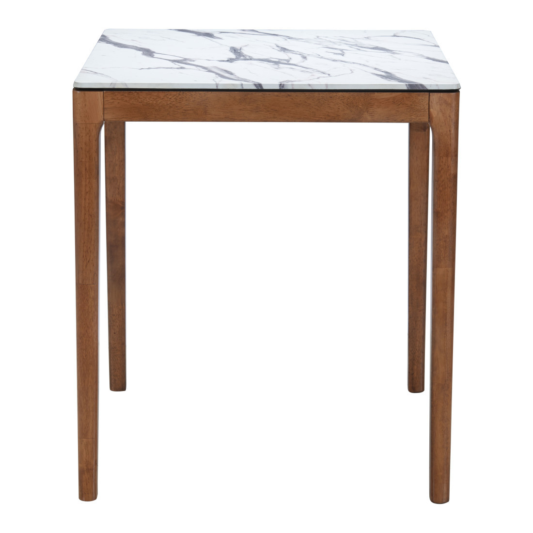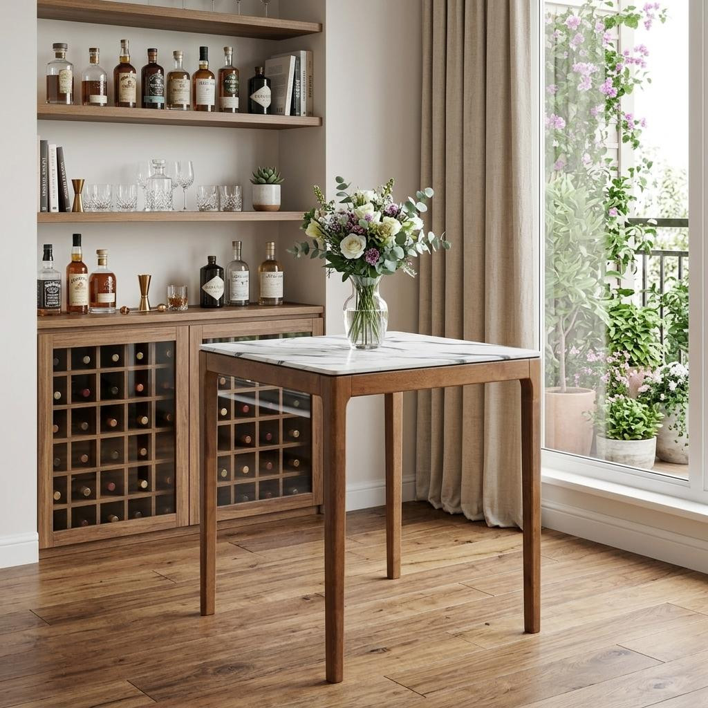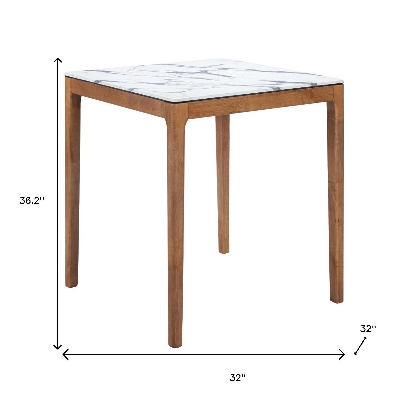 The 32-inch white and natural faux marble and solid wood square bar table is a striking addition to any dining space. Featuring a modern style, this table boasts a chic square design perfect for both casual and elegant settings. The top is crafted from durable faux marble in a pristine white, providing a sophisticated surface for dining or entertaining. Set upon a sturdy base made of solid wood in a natural finish, the table combines aesthetics with stability. The fixed table mechanism ensures it remains steady, while the four-leg base type allows for ample legroom and comfort. With machine-made construction, this piece guarantees quality and longevity, making it an ideal centerpiece for bars and restaurants alike. 36.20-inch h x 32.00-inch w x 32.00-inch d.