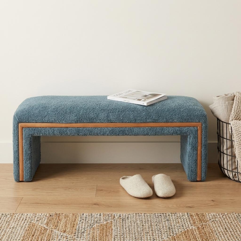 fabric solid wood upholstered bench, solid wood upholstered bench, wood upholstered bench, brown fabric solid wood upholstered, 56" blue brown fabric |