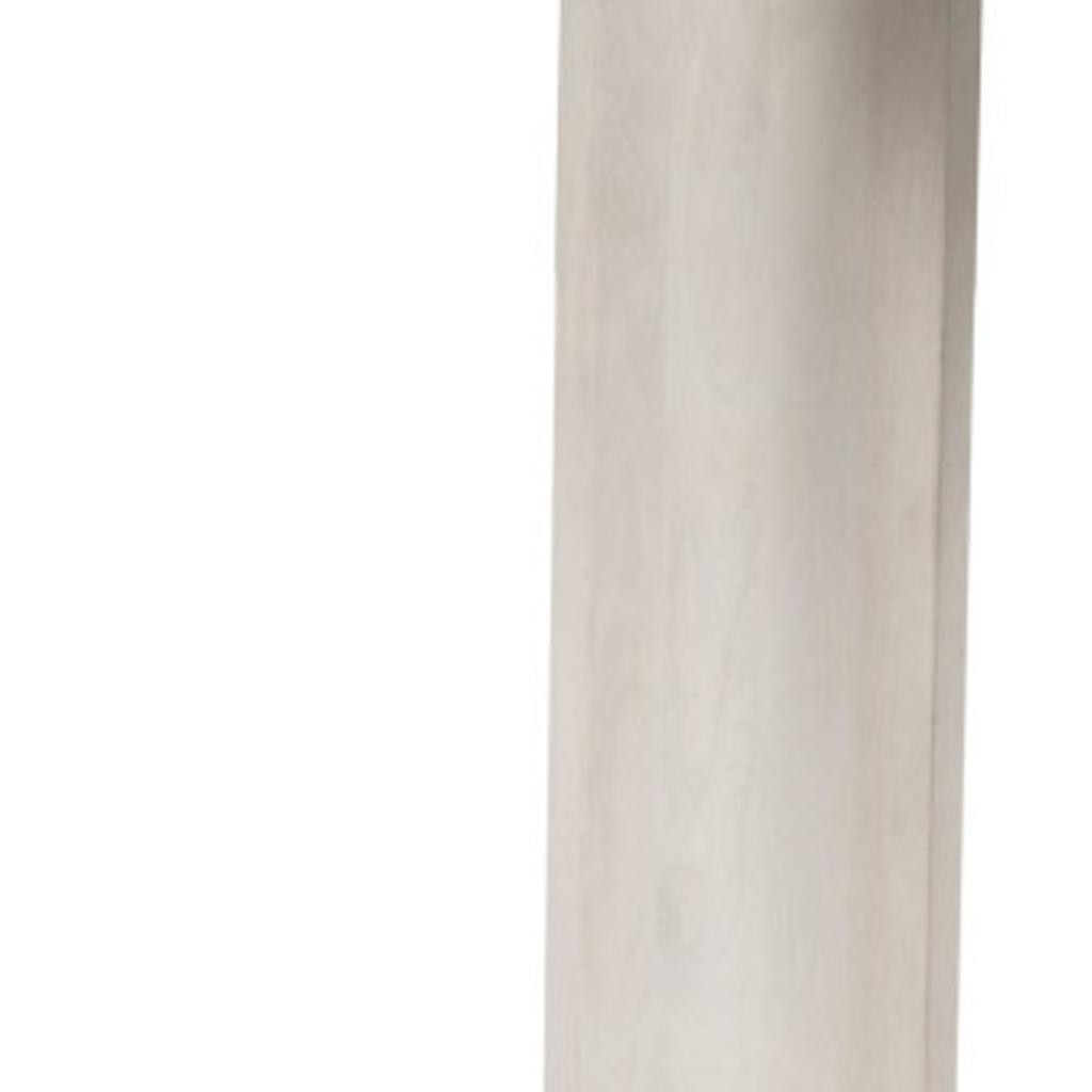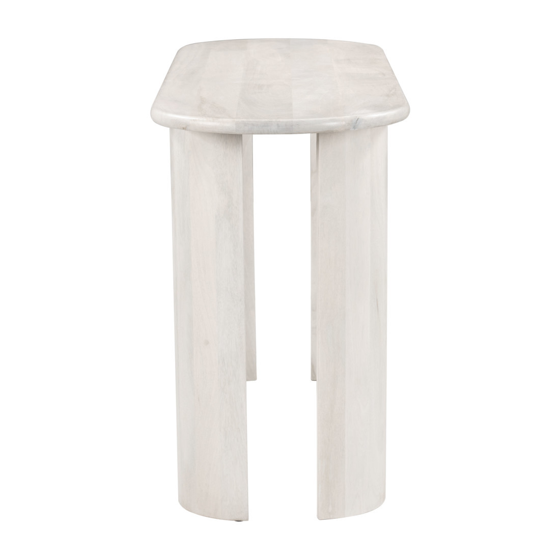 This 58-inch white solid wood oval console table can provide a variety of practical functions such as providing extra storage space, serving as a display area for decorative items or acting as a catch-all for keys, mail, and other small items. The oval shape and whitewashed bleached finish of this solid mango wood console table promotes a soft, elegant, and stylish environment. Ideal for living rooms, bedrooms, home offices, and lounge areas, this modern minimalist console table is not only good looking but multi-functional and practical addition to your space. 29.90-inch h x 58.00-inch w x 19.00-inch d.