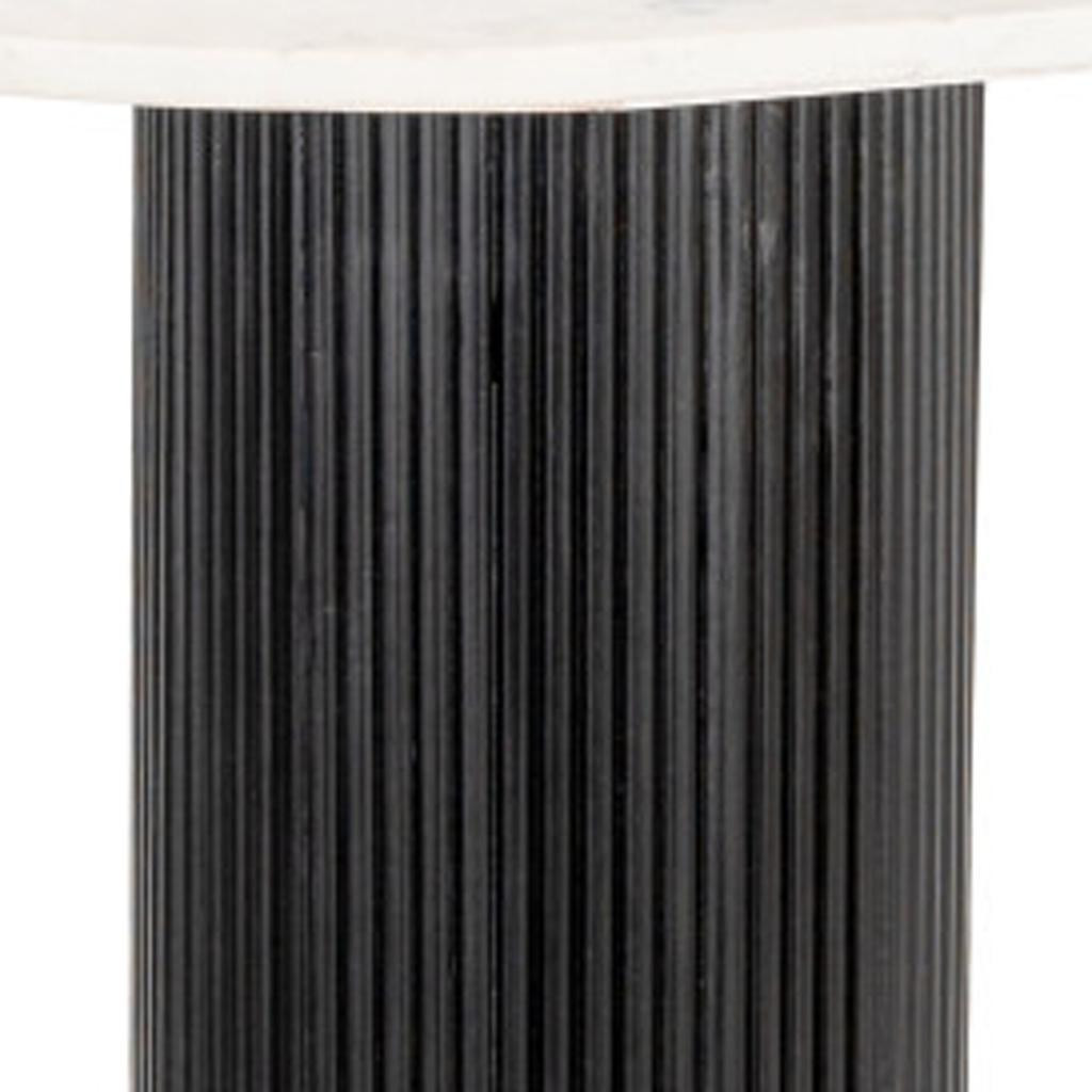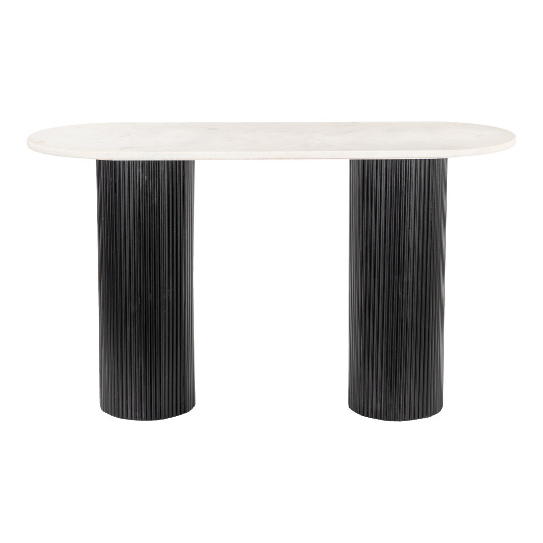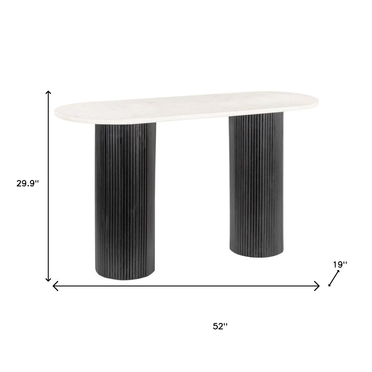 Transform your home with our elegant and versatile 52-inch white and black genuine marble and solid wood oval double pedestal console table. Don't miss out on the perfect finishing touch for your home. If you are searching for a unique piece of furniture, choose this white console table with its gorgeous genuine marble top. Each slab has true veining and no two are exactly alike. The double pedestal bases are made of rib textured solid mango wood, finished in black which creates a striking visual contrast to the top surface. Ideal for living rooms, bedrooms, home offices, hallways, and lounge areas, this console table is not only good looking but a multi-functional addition to your space. 29.90-inch h x 52.00-inch w x 19.00-inch d.