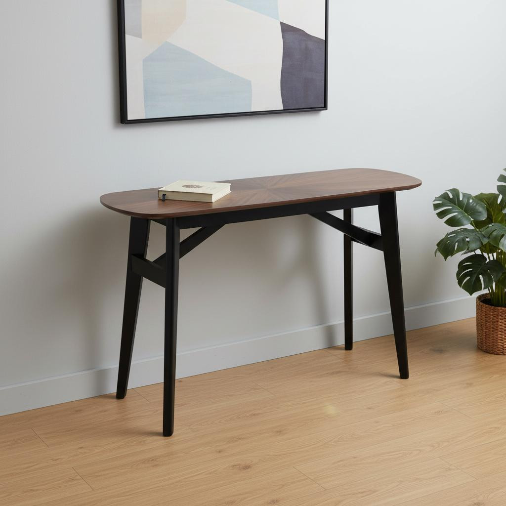 This 48-inch espresso and black solid wood oval console table is a high-quality, long-lasting piece of furniture that you can enjoy for years to come. Oval tables trump rectangular tables when it comes to small spaces, as their lack of corners means they visually occupy less space. This unit has a espresso genuuine hardwood tabletop. The four leg base is made of solid wood, the most strong and durable option available. Ideal for living rooms, bedrooms, home offices, and lounge areas, this console table is not only good looking but multi-functional and practical addition to your space. 29.90-inch h x 48.00-inch w x 16.00-inch d.