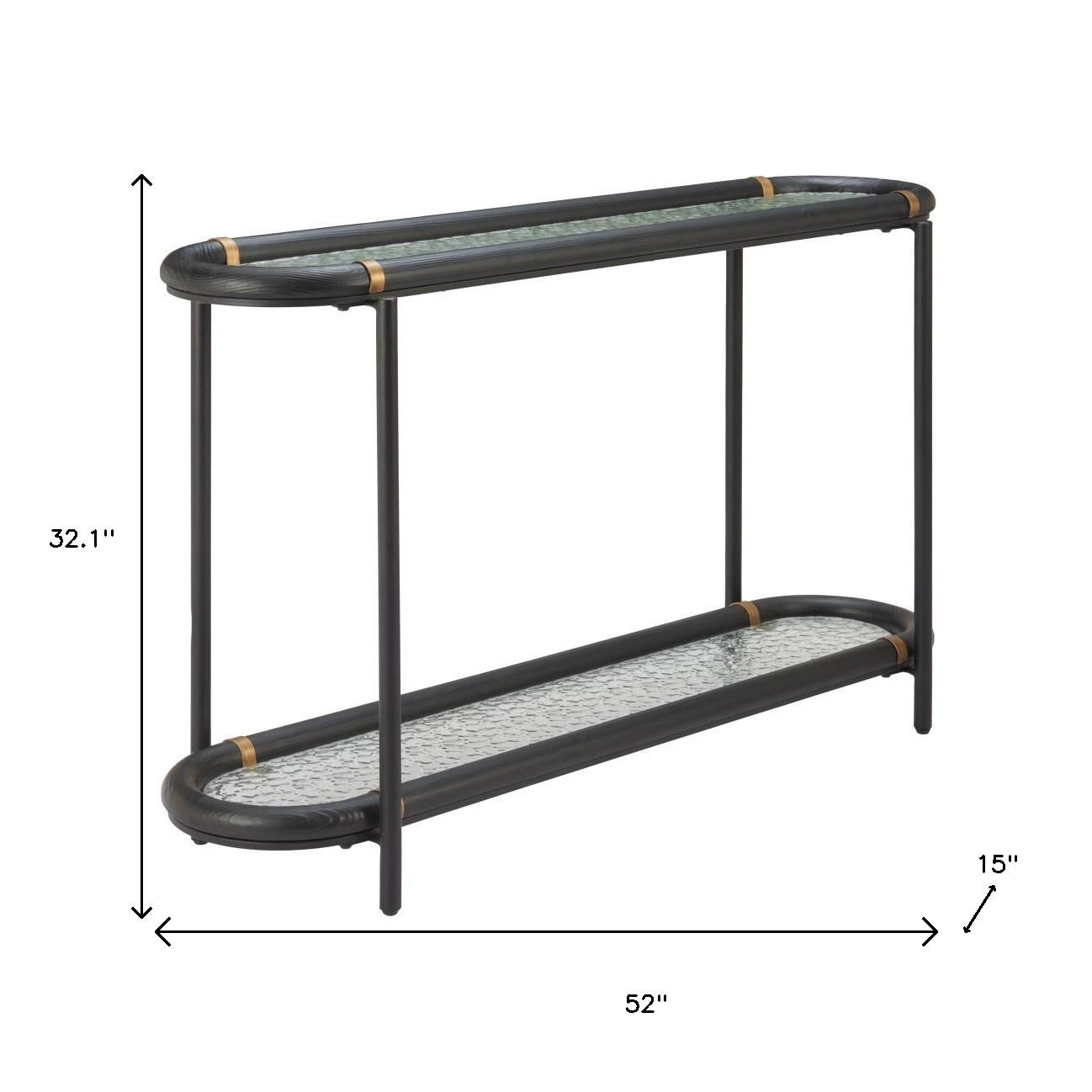 This 52-inch black and clear glass solid wood and steel oval console table with shelf is a high-quality, long-lasting piece of furniture that you can enjoy for years to come. The oval shape of this table will soften the flow of any room. Despite its luxurious appearance, the black and clear glass top is easy to maintain and clean, making it a practical option for those seeking both style and functionality. The black and clear hardwood table surface makes this unit stand out with its high quality material and construction. In addition to a great top, our console table has a steel four leg base, meaning that it is well-built and secure. Versatile in use, console tables can be used for a variety of purposes in a variety of rooms and settings. 32.10-inch h x 52.00-inch w x 15.00-inch d.