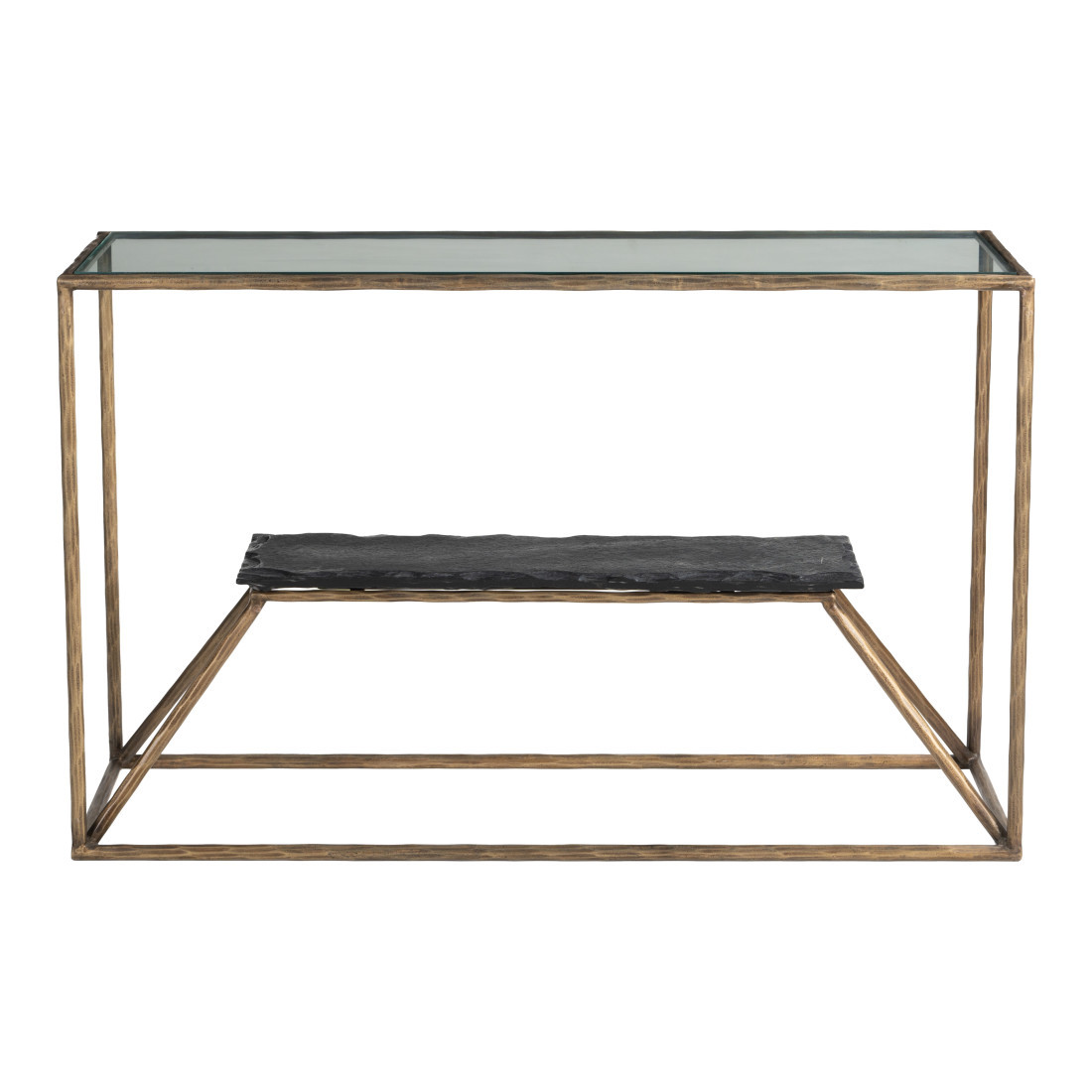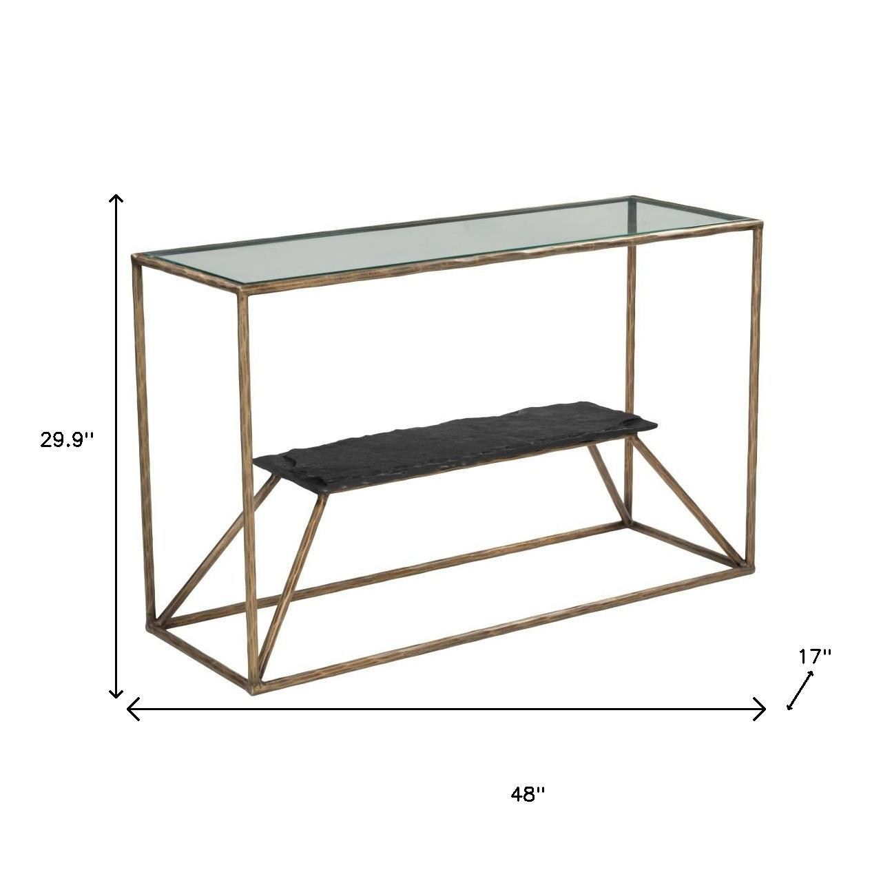 stone frame console table shelf, iron stone frame console table, frame console table shelf, glass iron stone frame console, 48" clear brass glass iron |