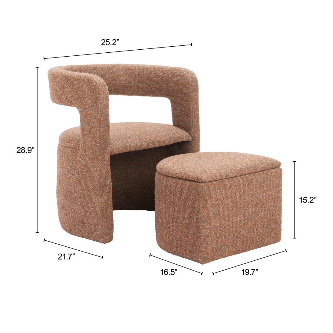 Add an air of fashion to your room and rejuvenate the space with this 26-inch brown upholstered arm chair with ottoman. This gorgeous solid color brown arm chair is masterfully upholstered in durable 100% polyester. Giving the chair stability and structure, the inner frame is constructed with high quality plywood, includes comfy armrests, and features a fixed back that comes complete with soft and comfortable cushioning. A comfy ottoman is included as part of the package. Great to rest your feet or provide extra seating in a pinch. 28.90-inch h x 26.00-inch w x 22.00-inch d.
