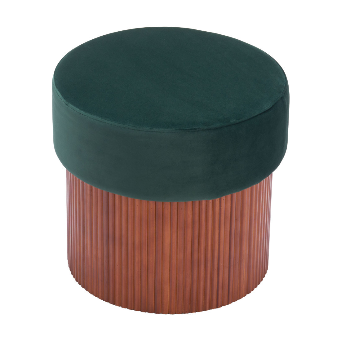 Get ready to relax with this 20-inch green and brown fabric round ottoman. The manufactured wood top of this ottoman is a nice contrast to the upholstery material. Expertly upholstered with padding in a soft solid color polyester, this ottoman is as comfortable as it is good looking. Ottomans are multi-functional additions to your space that add fashion and practical value. 18.30-inch h x 20.00-inch w x 20.00-inch d.