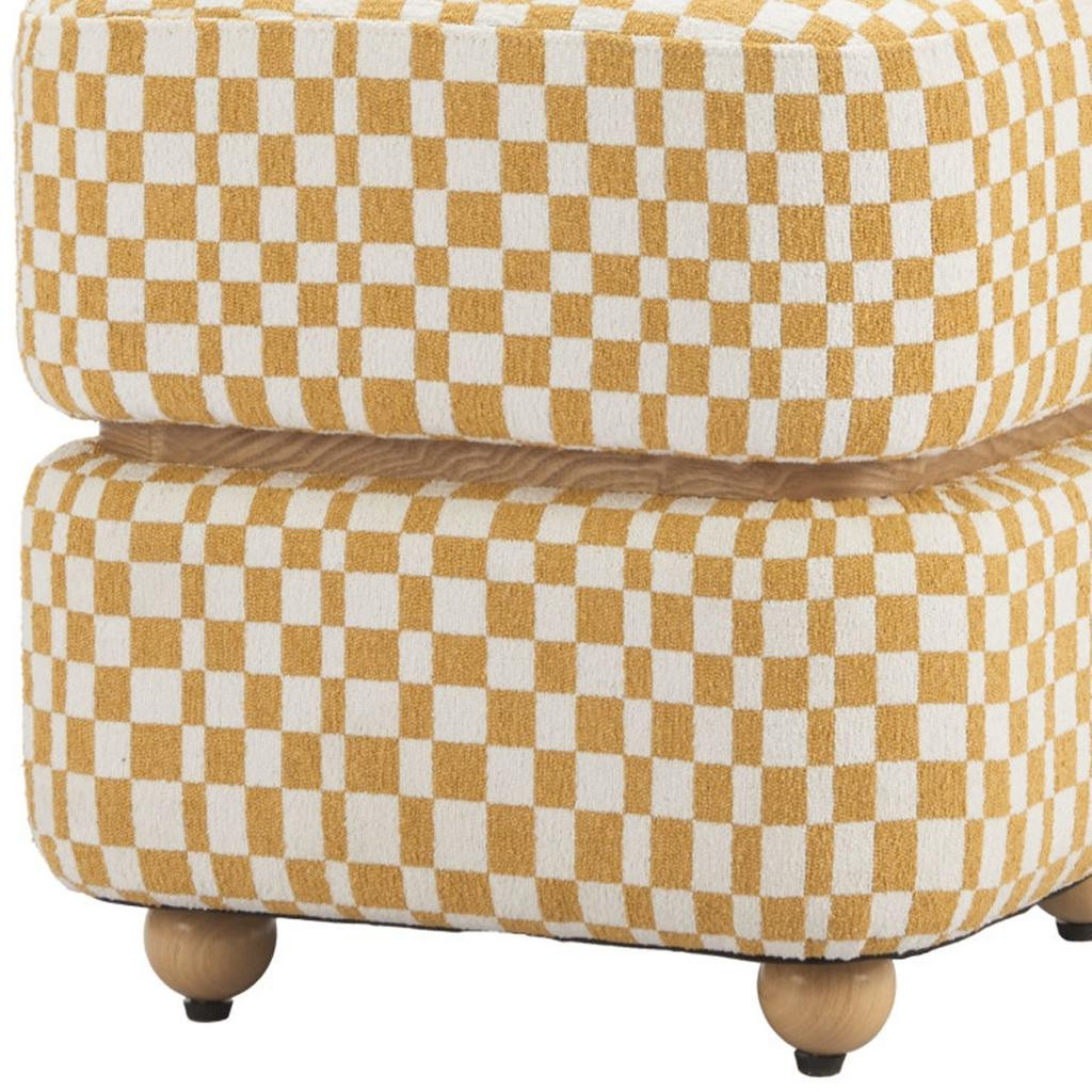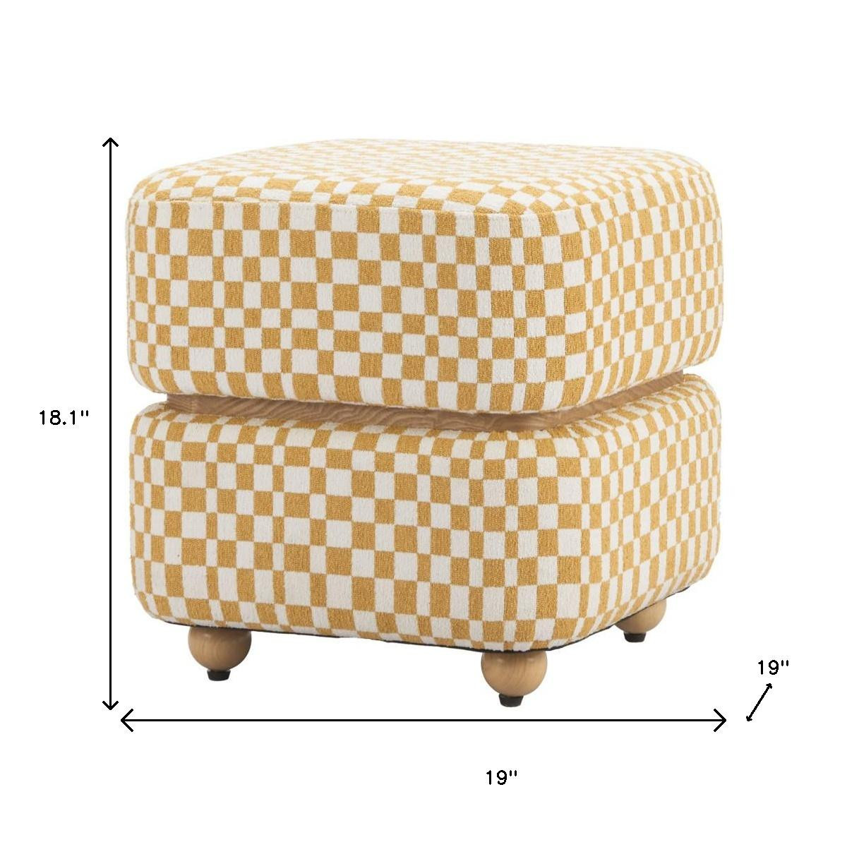 Get ready to relax with this 19-inch natural and yellow fabric ottoman. The manufactured wood top of this ottoman is a nice contrast to the upholstery material. Expertly upholstered with padding in a soft solid color polyester, this ottoman is as comfortable as it is good looking. Easy to blend into most any room, a ottoman is a way to add a good looking accent to your space that can also be practical and useful. 18.10-inch h x 19.00-inch w x 19.00-inch d.