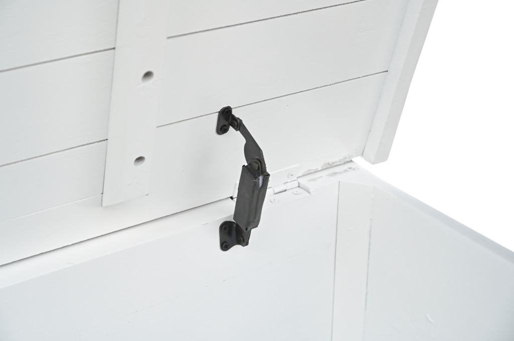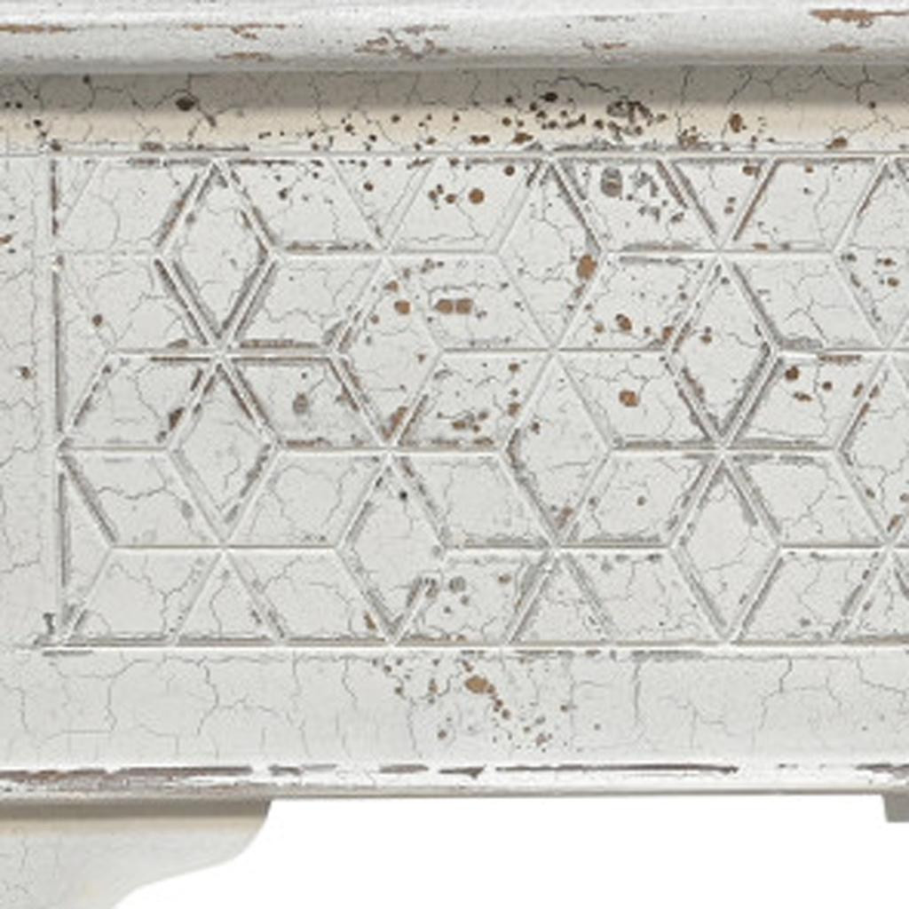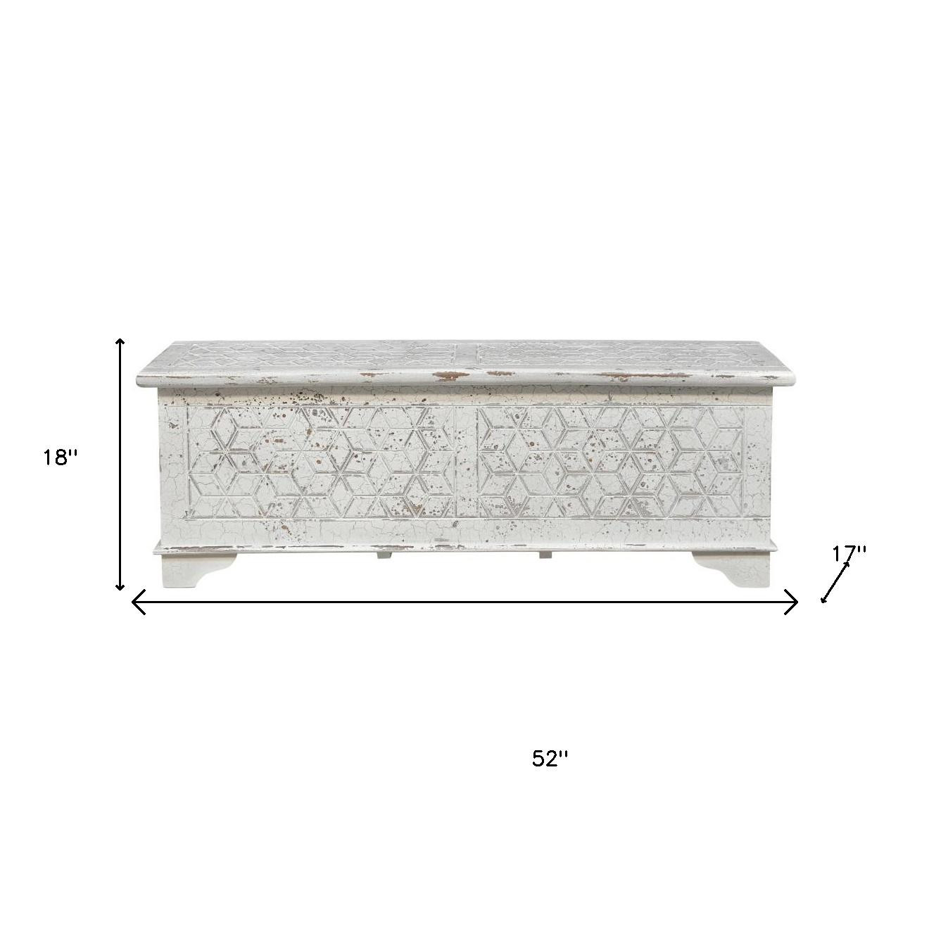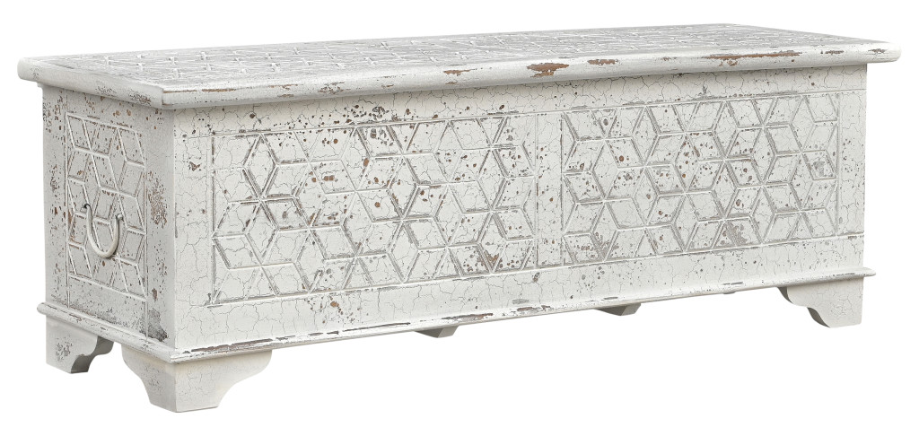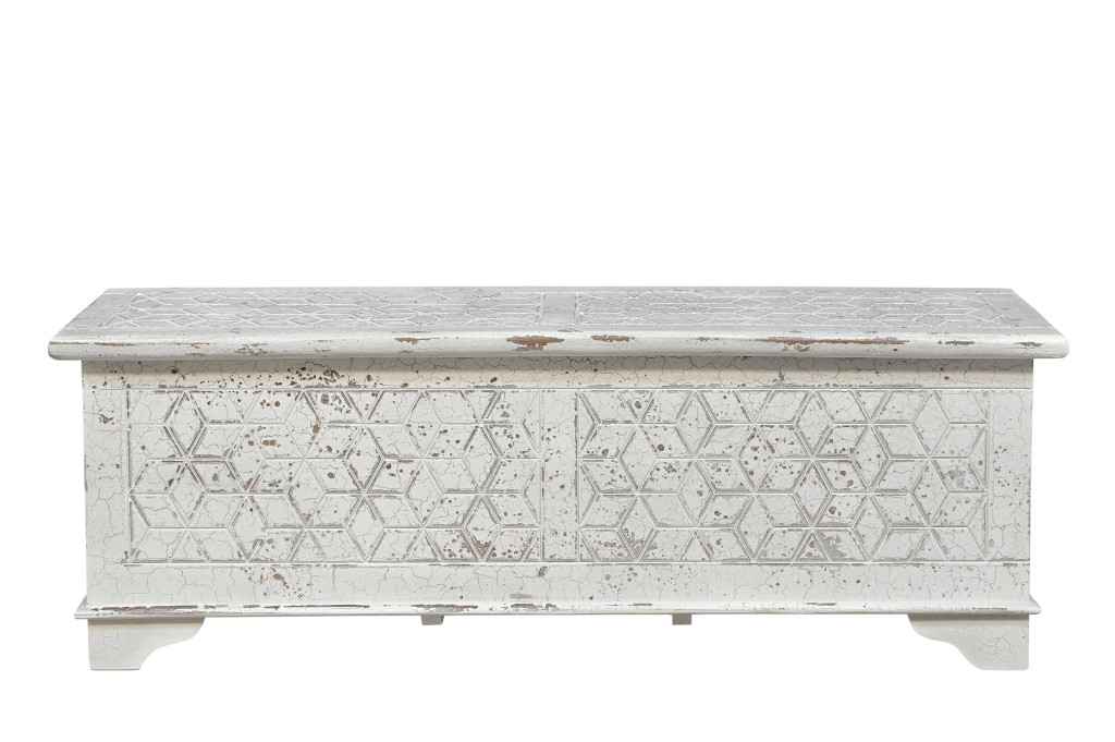 Optimize your space and add some charm to your room with the 52-inch white solid wood geometric storage ottoman. Designed to discretely add hidden storage to your room without sacrificing seating or foot rest space. This ottoman features quality construction from solid wood with a geometric carved design. The purposefully distressed finish gives this versatile ottoman an authentically rustic feel. Ottomans are multi-functional additions to your space that add fashion and practical value. 18.00-inch h x 52.00-inch w x 17.00-inch d.