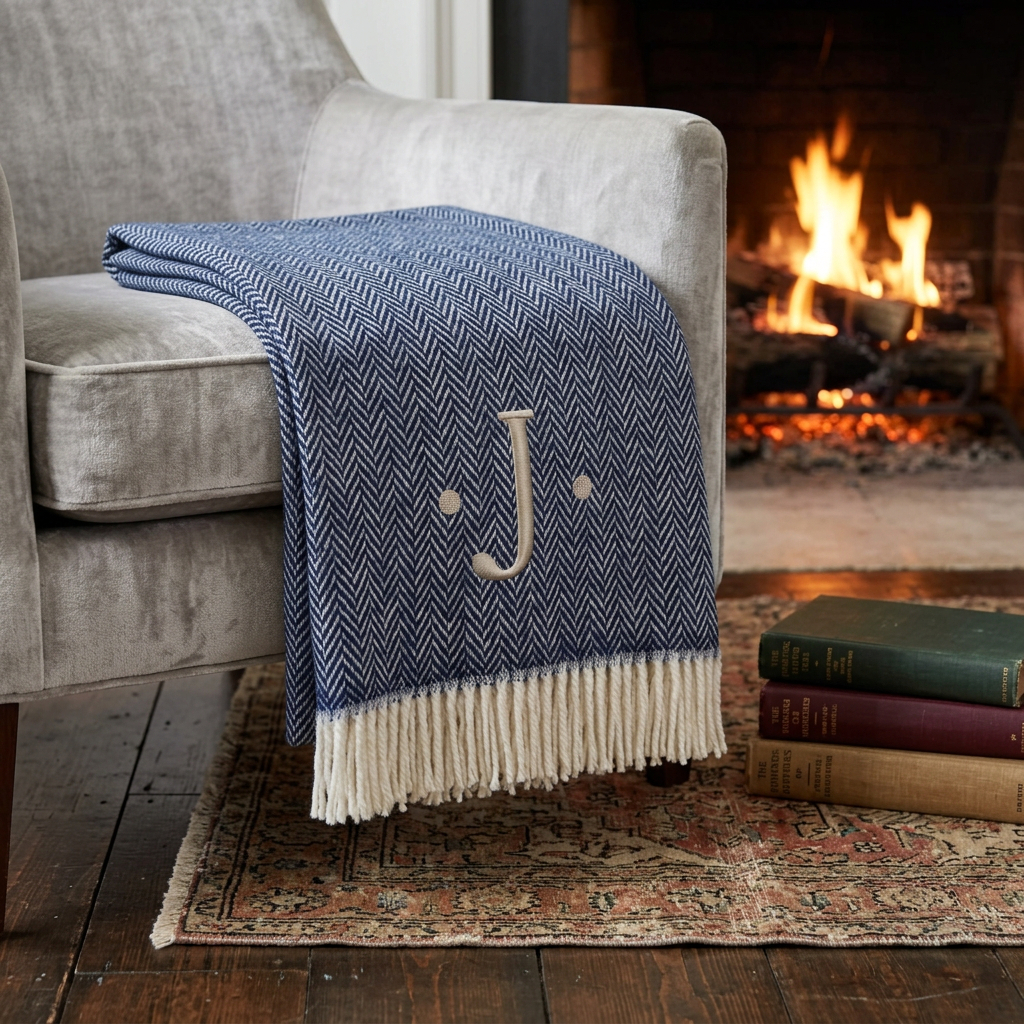 Whether you're curling up for movie night or you need an extra layer of warmth as you drift off to sleep, this 55-inch x 70-inch navy blue and white herringbone cotton blend "J" throw blanket with tassels and embroidery is the perfect solution. Features a woven herringbone design that offers sumptuous softness and texture that you'll cherish for years to come. Made from cotton blend this blanket will make a great addition to any room it's added to. Versatile to decorate with your first or last name, this embroidered monogram initial blanket will add some personalized style to your space or be a great gift. This cozy throw blanket makes the perfect add-on to movie nights and lazy afternoons. 70.00-inch h x 55.00-inch w x 0.50-inch d.