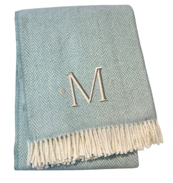 initial throw blanket tassels embroidery, throw blanket tassels embroidery, blanket tassels embroidery, cotton blend initial throw blanket, sky blue white herringbone cotton |