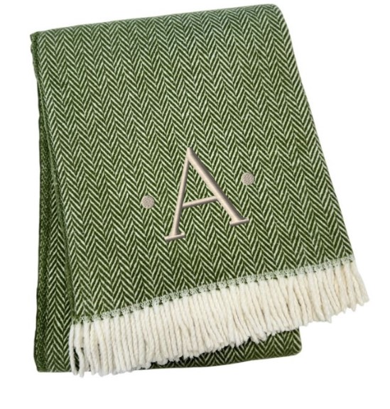initial throw blanket tassels embroidery, cotton blend initial throw blanket, throw blanket tassels embroidery, blanket tassels embroidery, moss green white herringbone cotton |