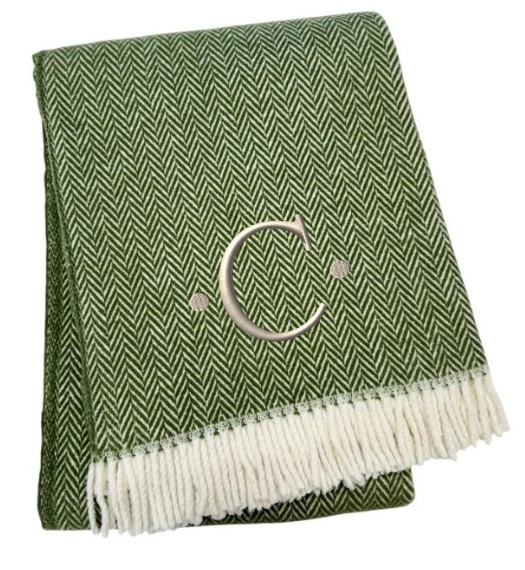 initial throw blanket tassels embroidery, throw blanket tassels embroidery, blanket tassels embroidery, cotton blend initial throw blanket, moss green white herringbone cotton |