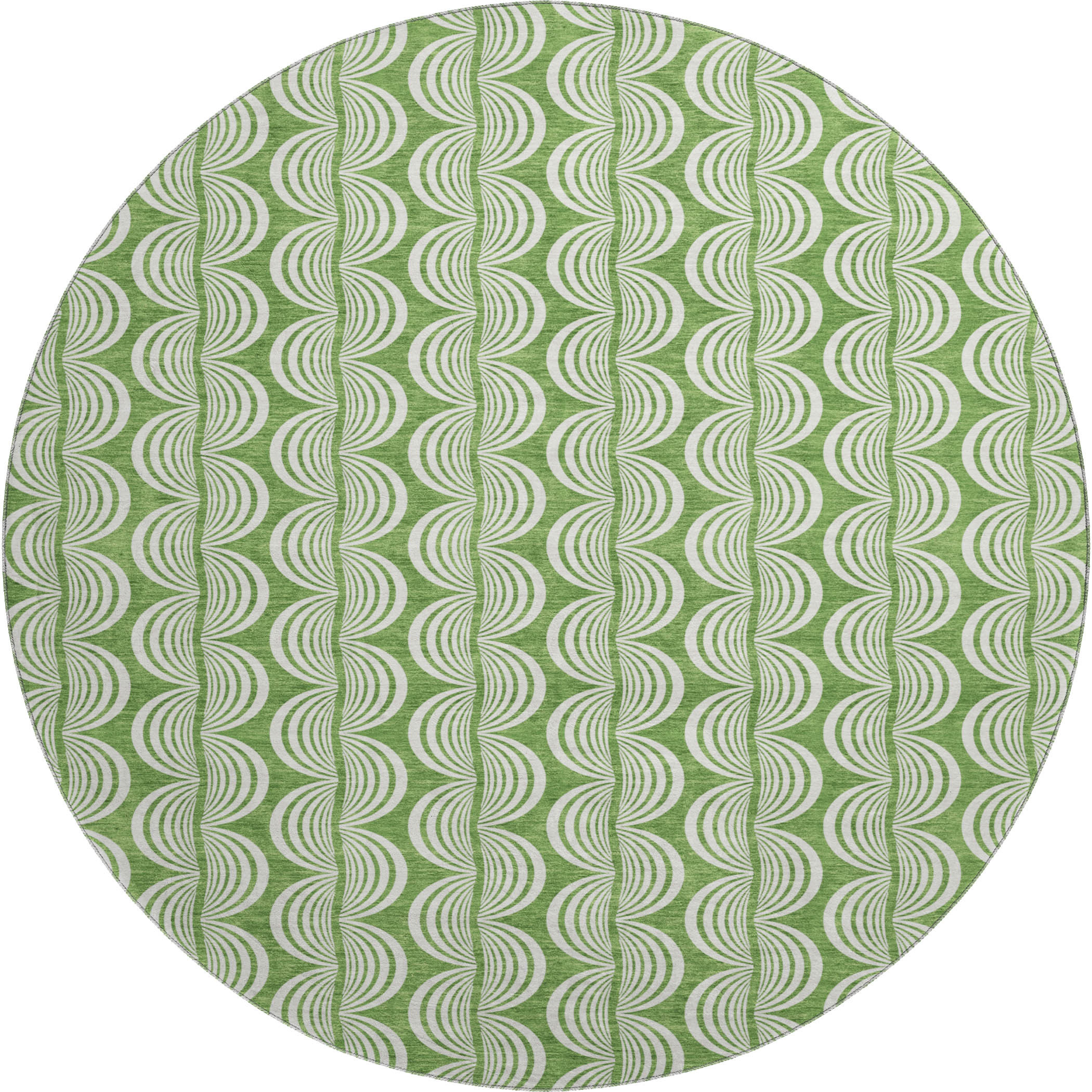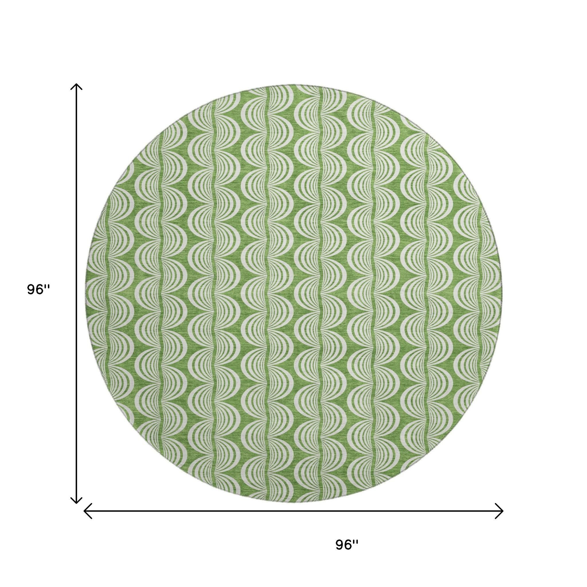 Add great coloration and comfortable texture to your space with this 8-foot green and ivory ogee washable round rug with uv protection. Ideal for spaces with kids and pets, this rug is stain resistant to help repel dirt and spilled liquids. Built to last, this rug crafted from polyester fibers is known for its durability and long lasting appeal. Rugs are a great way to showcase your style, hide imperfections, warm your home and reduce noise. This larger sized, transitional styled rug is ready to create a focal point or statement piece in your room. 96.00-inch h x 96.00-inch w x 0.39-inch d.