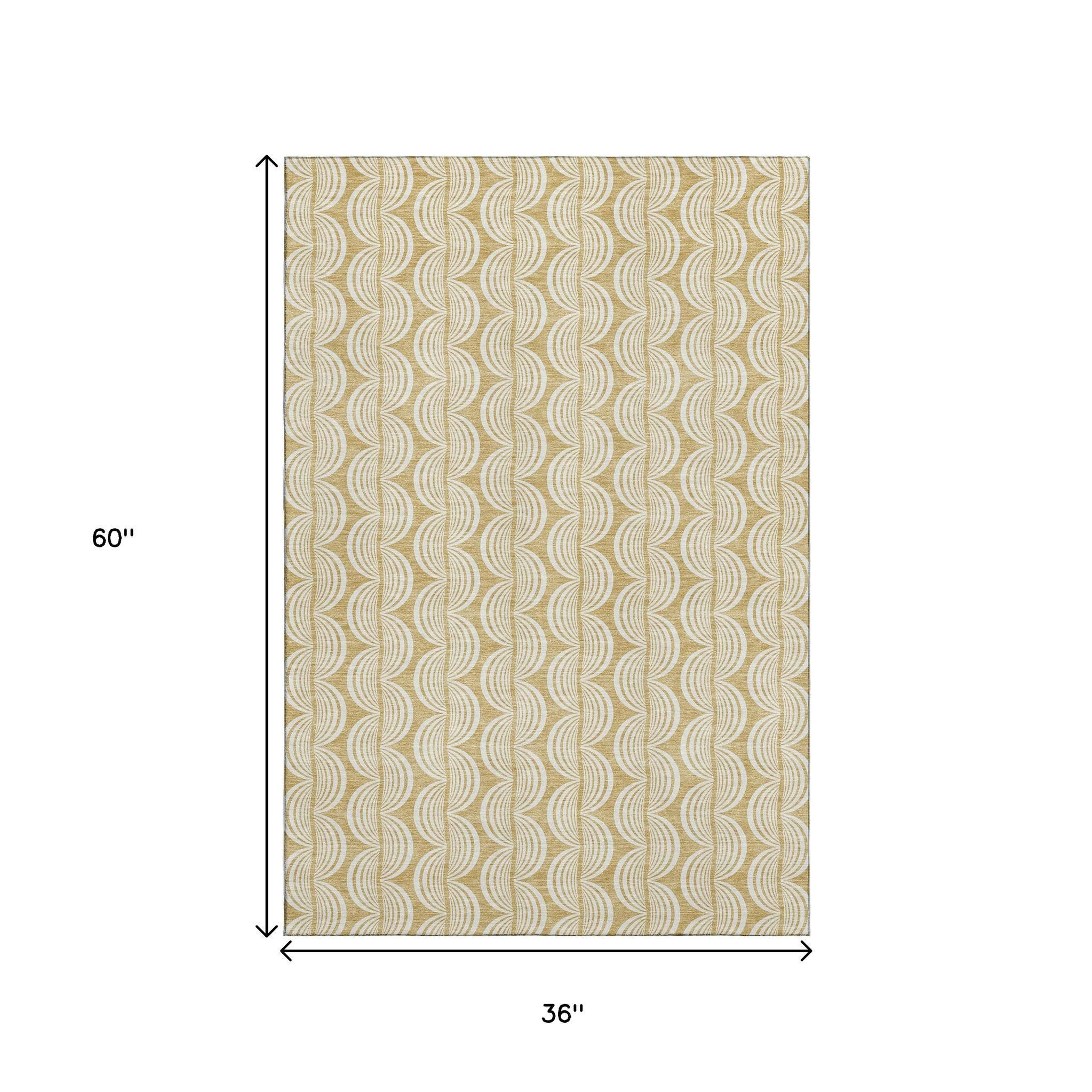 Set an inviting tone in your space with this 3-foot x 5-foot gold and ivory ogee washable area rug with uv protection. Ideal for spaces with kids and pets, this rug is stain resistant to help repel dirt and spilled liquids. Built to last, this rug crafted from polyester fibers is known for its durability and long lasting appeal. Rugs are a great way to showcase your style, hide imperfections, warm your home and reduce noise. This smaller sized, transitional styled rug is just what you need for your walkway, bedside, in front of door, cabinet, refrigerator, or chair. 36.00-inch h x 60.00-inch w x 0.39-inch d.