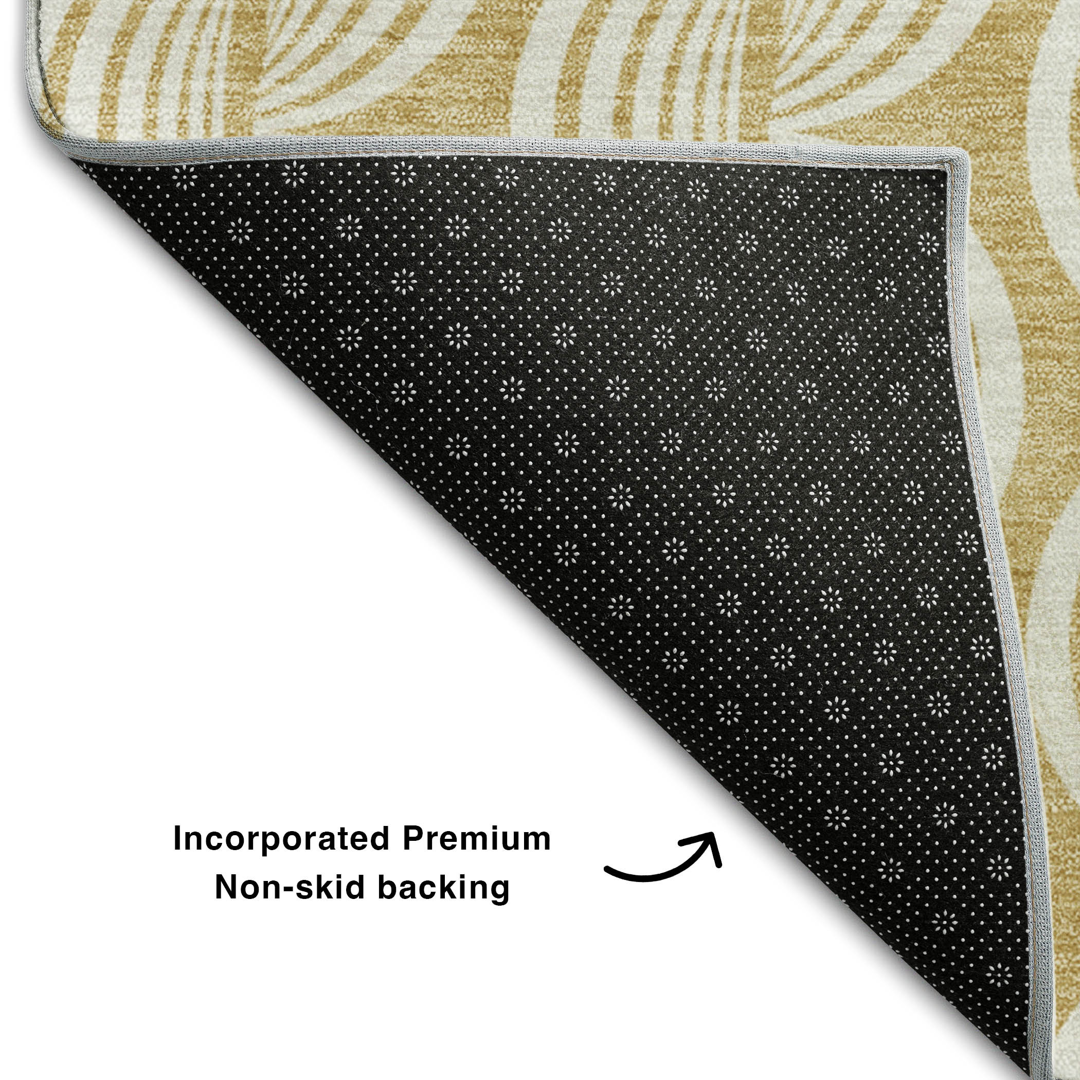 Add great coloration and comfortable texture to your space with this 5-foot x 8-foot gold and ivory ogee washable area rug with uv protection. Ideal for spaces with kids and pets, this rug is stain resistant to help repel dirt and spilled liquids. Built to last, this rug crafted from polyester fibers is known for its durability and long lasting appeal. Rugs are a great way to showcase your style, hide imperfections, warm your home and reduce noise. This larger sized, transitional styled rug is ready to create a focal point or statement piece in your room. 60.00-inch h x 90.00-inch w x 0.39-inch d.