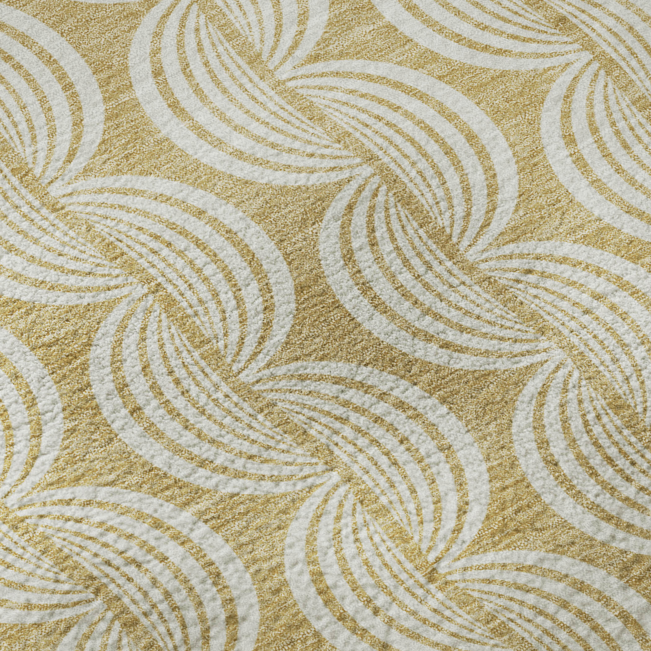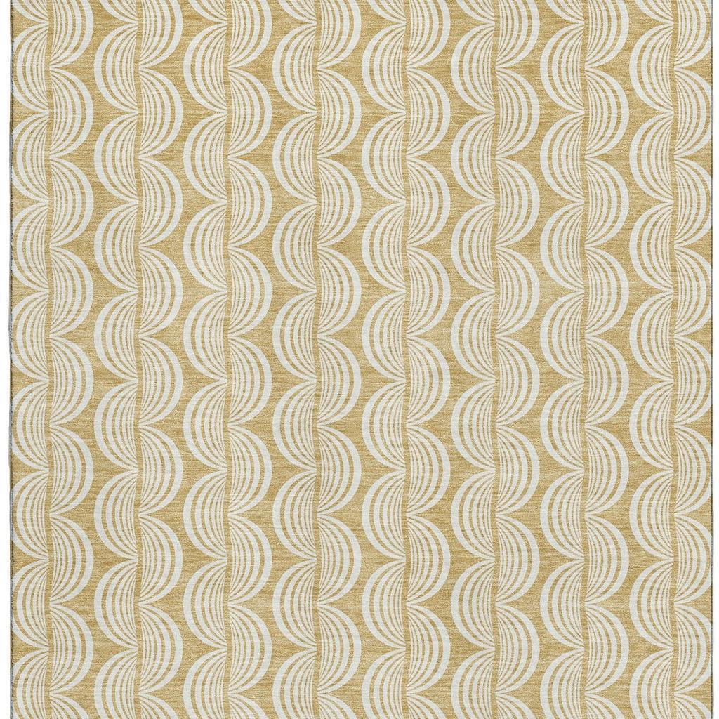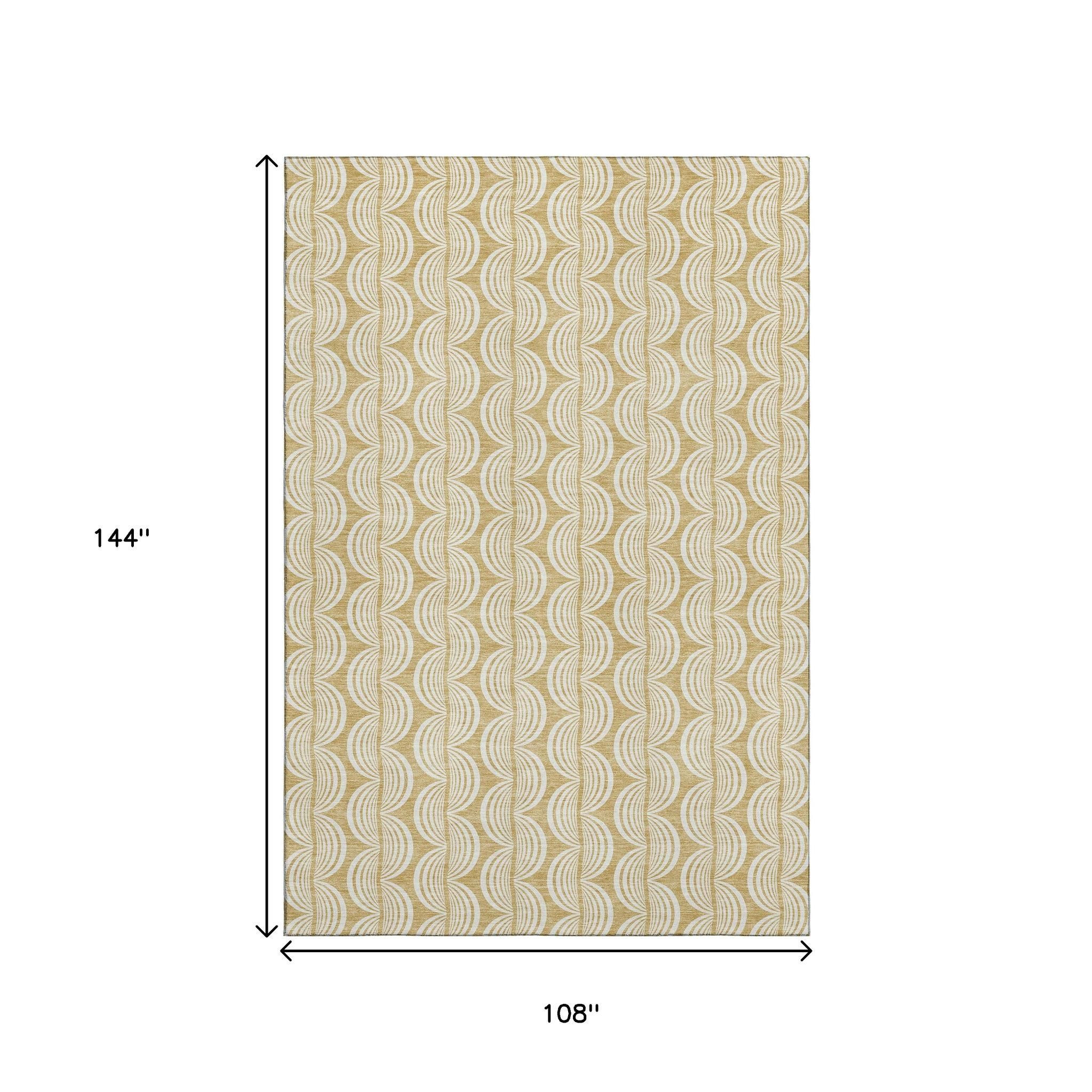 This 9-foot x 12-foot gold and ivory ogee washable area rug with uv protection, is a great way to add warmth to a room. Ideal for spaces with kids and pets, this rug is stain resistant to help repel dirt and spilled liquids. Built to last, this rug crafted from polyester fibers is known for its durability and long lasting appeal. Rugs are a great way to showcase your style, hide imperfections, warm your home and reduce noise. This larger sized, transitional styled rug is ready to create a focal point or statement piece in your room. 108.00-inch h x 144.00-inch w x 0.39-inch d.