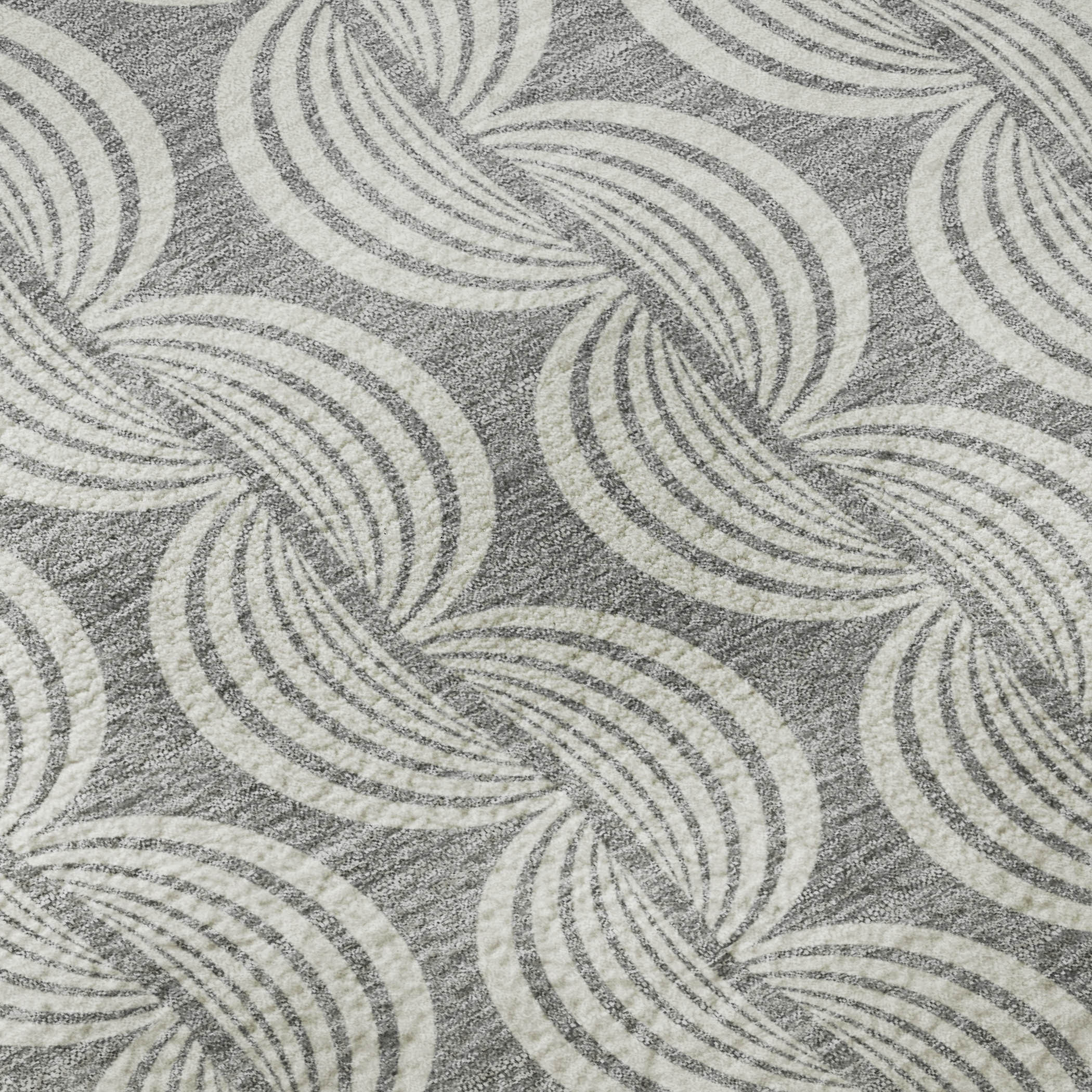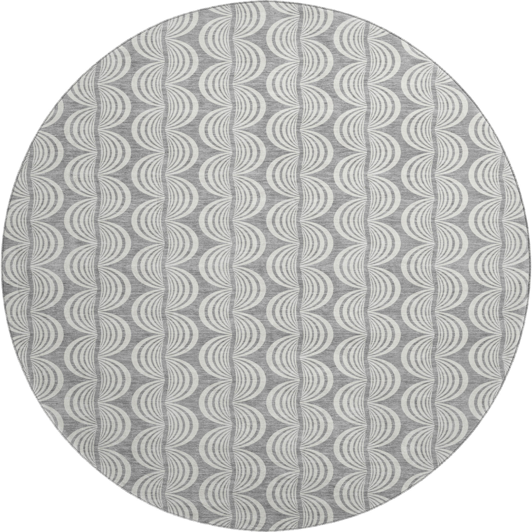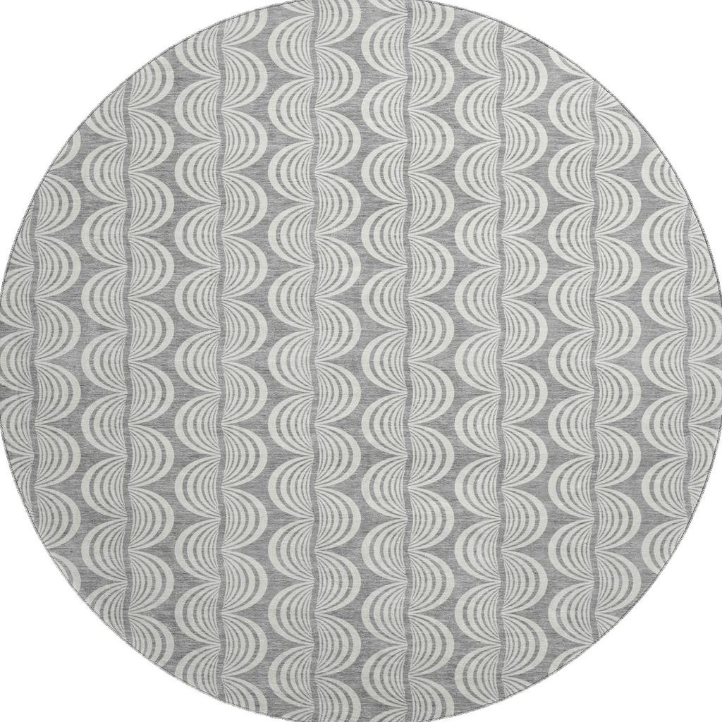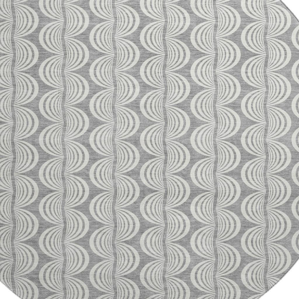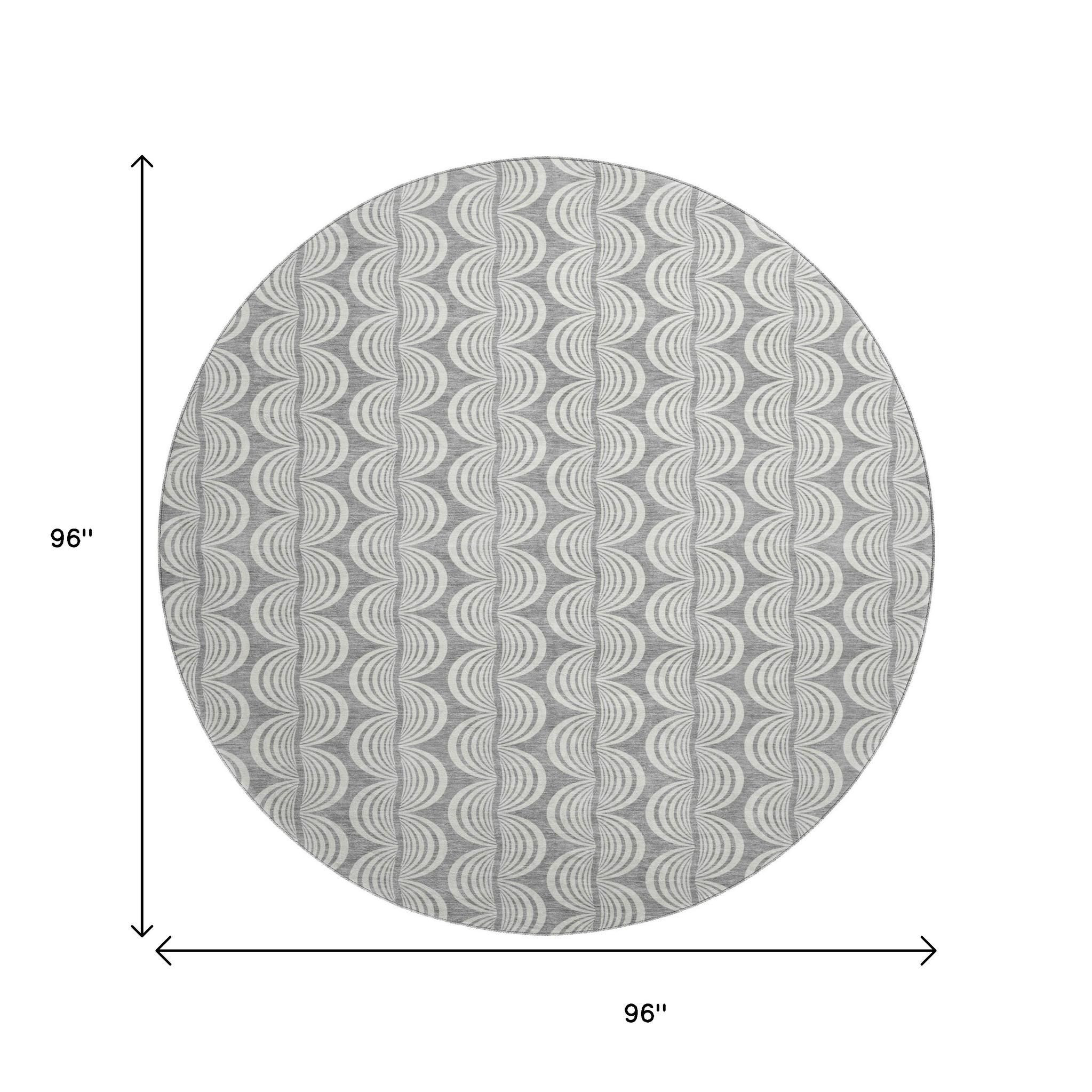 This 8-foot gray and ivory ogee washable round rug with uv protection, is a great way to add warmth to a room. Ideal for spaces with kids and pets, this rug is stain resistant to help repel dirt and spilled liquids. Built to last, this rug crafted from polyester fibers is known for its durability and long lasting appeal. Rugs are a great way to showcase your style, hide imperfections, warm your home and reduce noise. This larger sized, transitional styled rug is ready to create a focal point or statement piece in your room. 96.00-inch h x 96.00-inch w x 0.39-inch d.