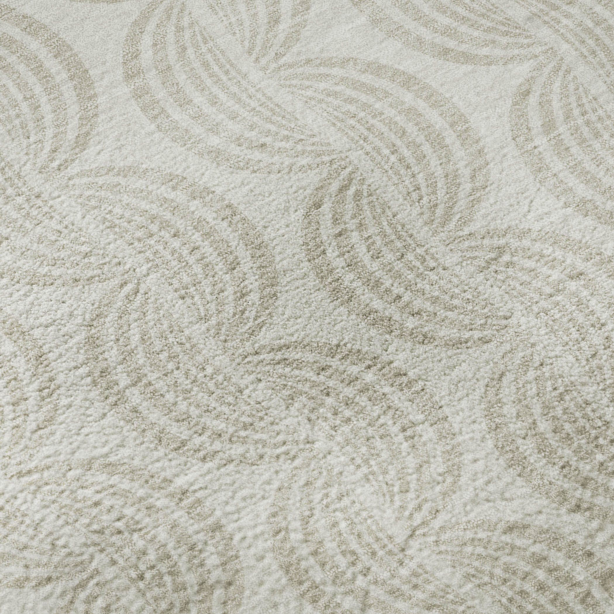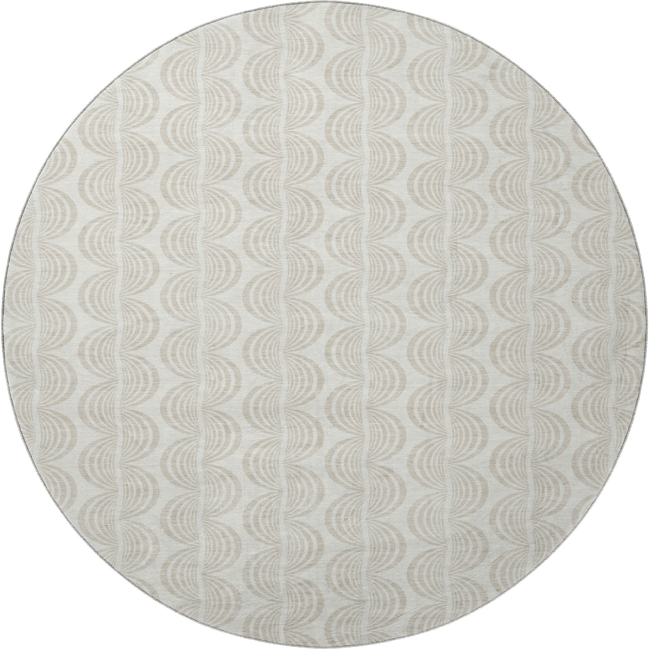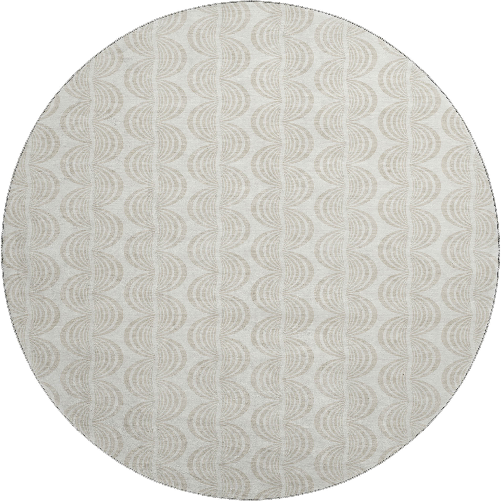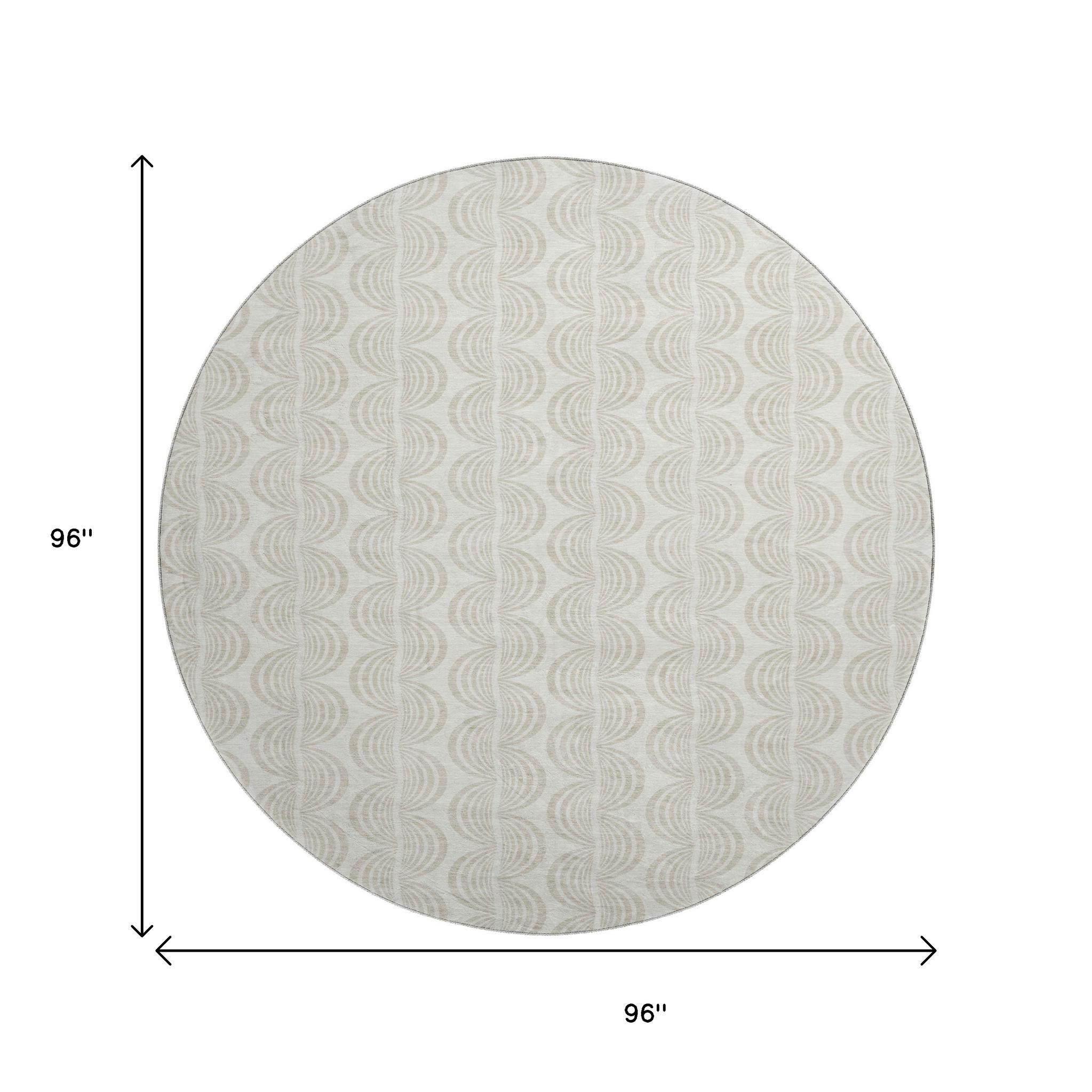 This 8-foot ivory and beige ogee washable round rug with uv protection, is a great way to add warmth to a room. Ideal for spaces with kids and pets, this rug is stain resistant to help repel dirt and spilled liquids. Built to last, this rug crafted from polyester fibers is known for its durability and long lasting appeal. Rugs are a great way to showcase your style, hide imperfections, warm your home and reduce noise. This larger sized, transitional styled rug is ready to create a focal point or statement piece in your room. 96.00-inch h x 96.00-inch w x 0.39-inch d.
