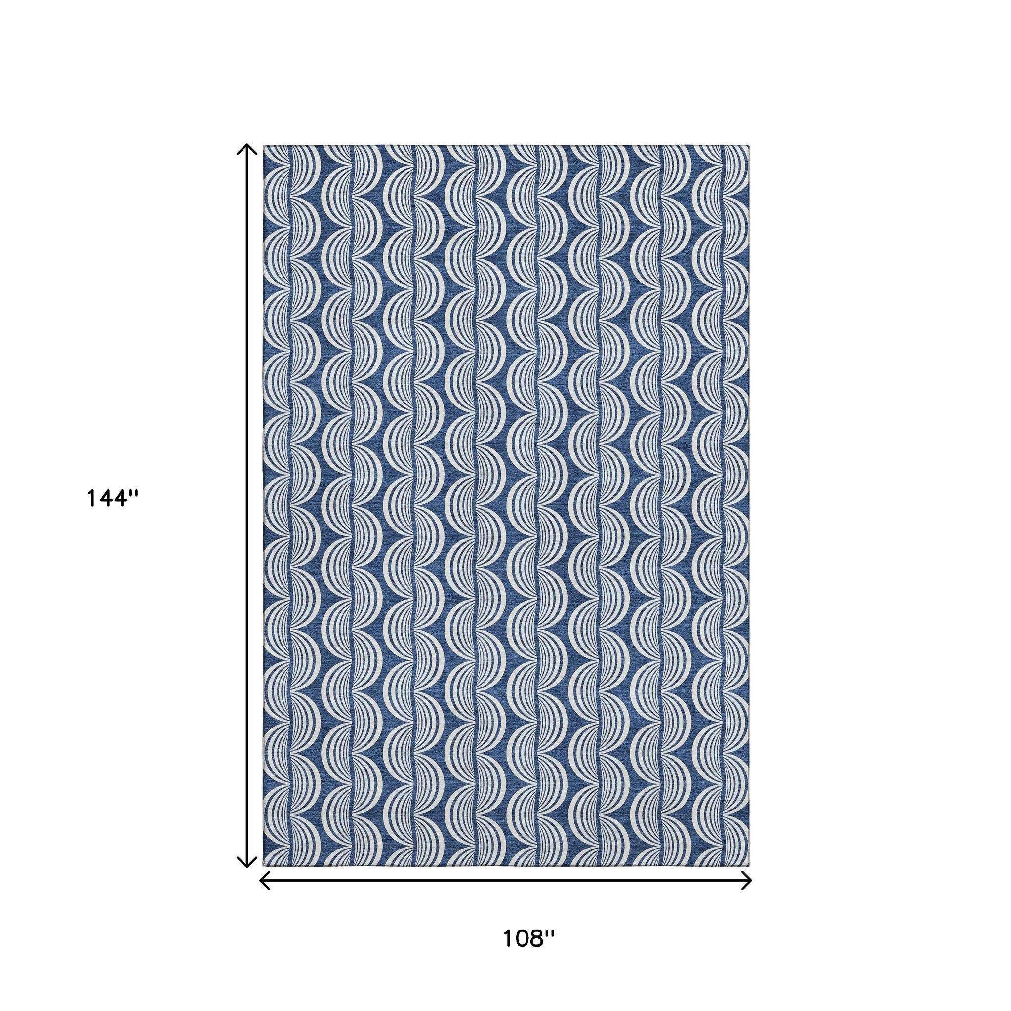 Add great coloration and comfortable texture to your space with this 9-foot x 12-foot navy blue and ivory ogee washable area rug with uv protection. Ideal for spaces with kids and pets, this rug is stain resistant to help repel dirt and spilled liquids. Built to last, this rug crafted from polyester fibers is known for its durability and long lasting appeal. Rugs are a great way to showcase your style, hide imperfections, warm your home and reduce noise. This larger sized, transitional styled rug is ready to create a focal point or statement piece in your room. 108.00-inch h x 144.00-inch w x 0.39-inch d.