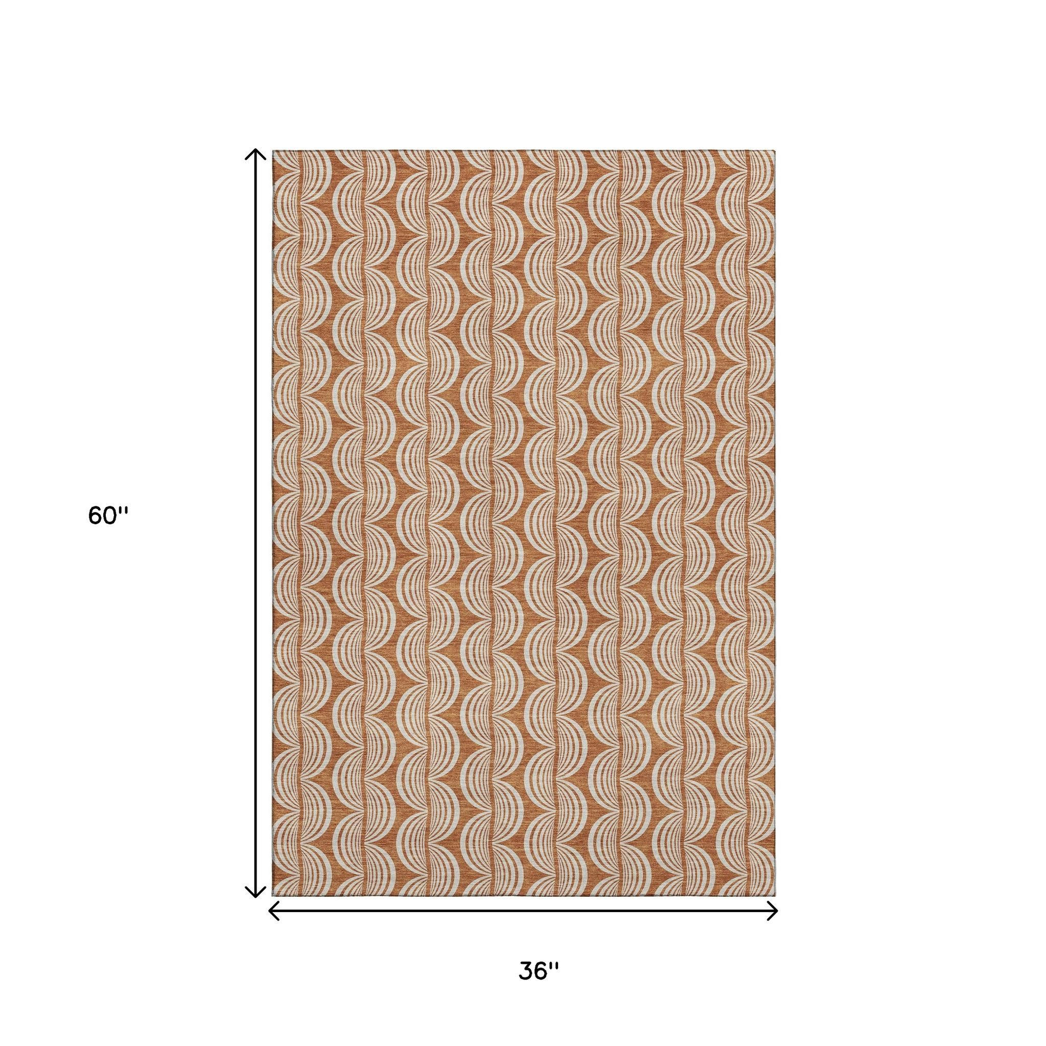 Add great coloration and comfortable texture to your space with this 3-foot x 5-foot rust and beige ogee washable area rug with uv protection. Ideal for spaces with kids and pets, this rug is stain resistant to help repel dirt and spilled liquids. Built to last, this rug crafted from polyester fibers is known for its durability and long lasting appeal. Rugs are a great way to showcase your style, hide imperfections, warm your home and reduce noise. This smaller sized, transitional styled rug is just what you need for your walkway, bedside, in front of door, cabinet, refrigerator, or chair. 36.00-inch h x 60.00-inch w x 0.39-inch d.