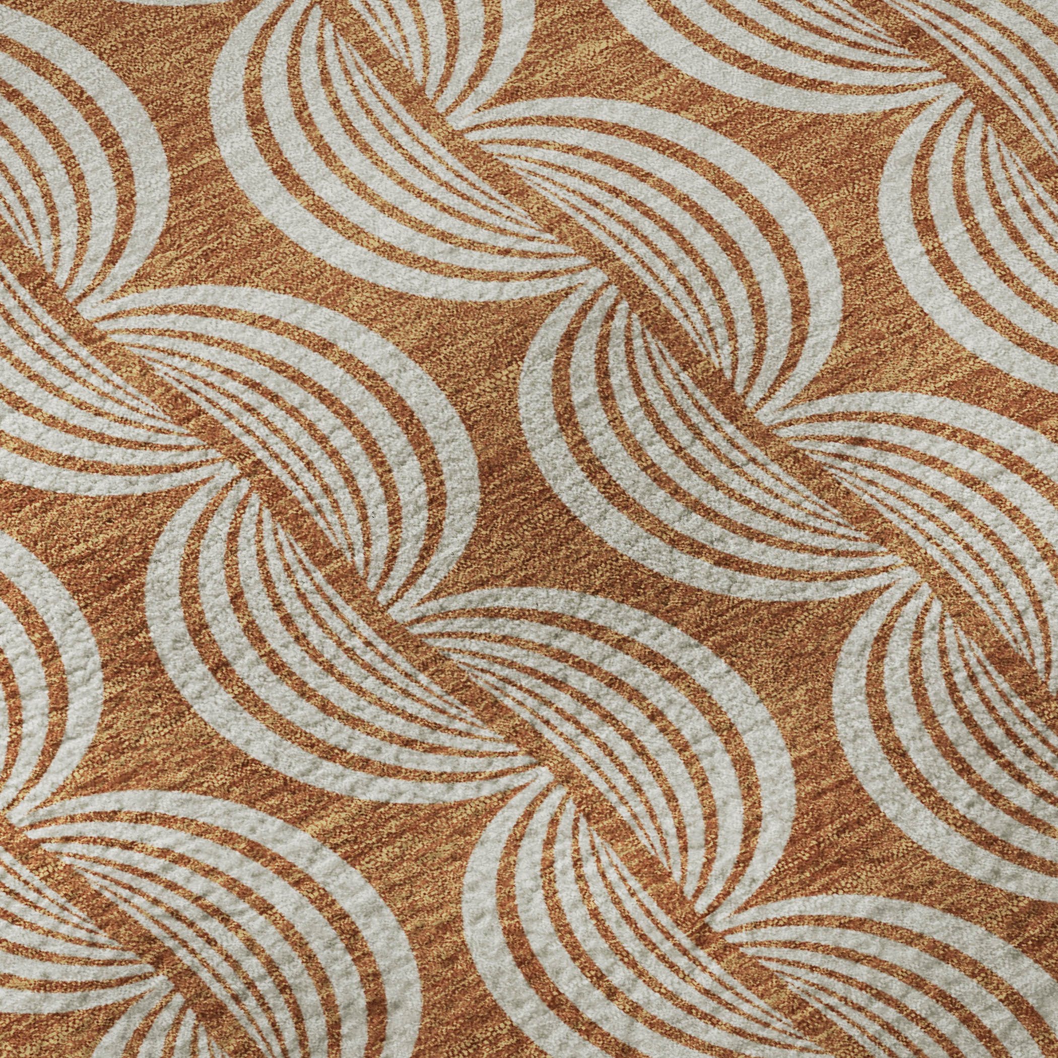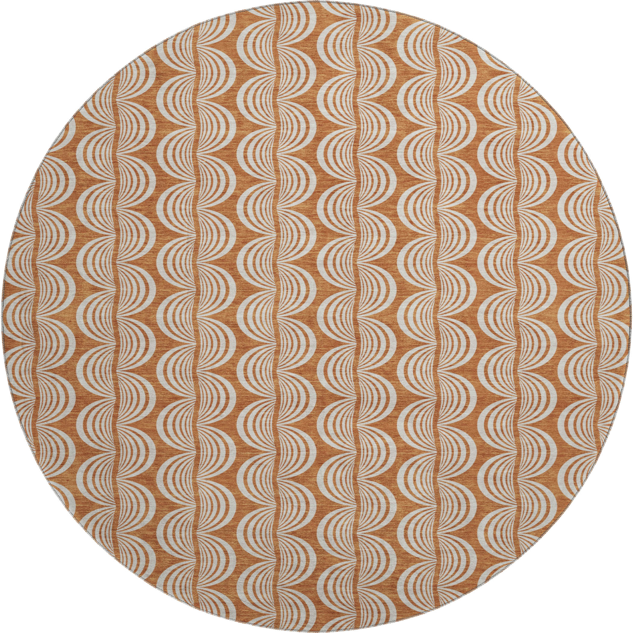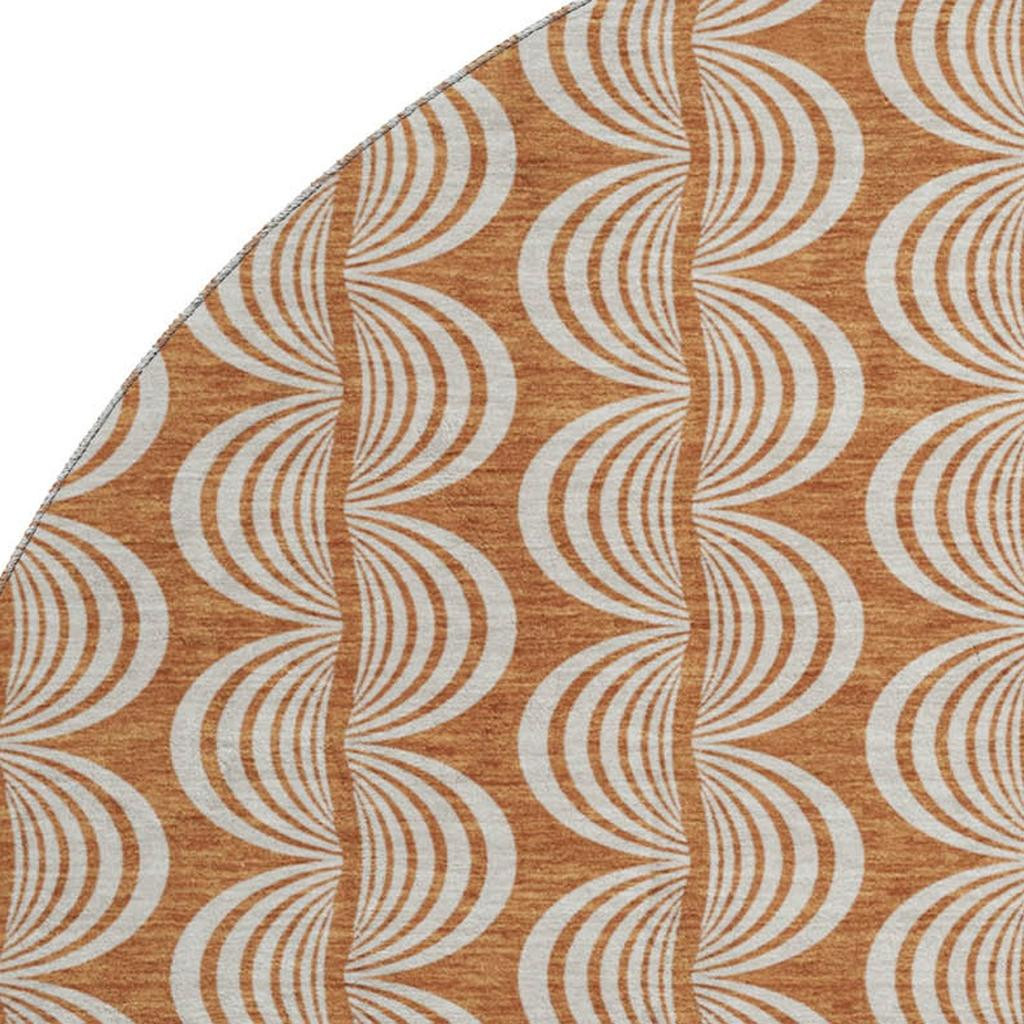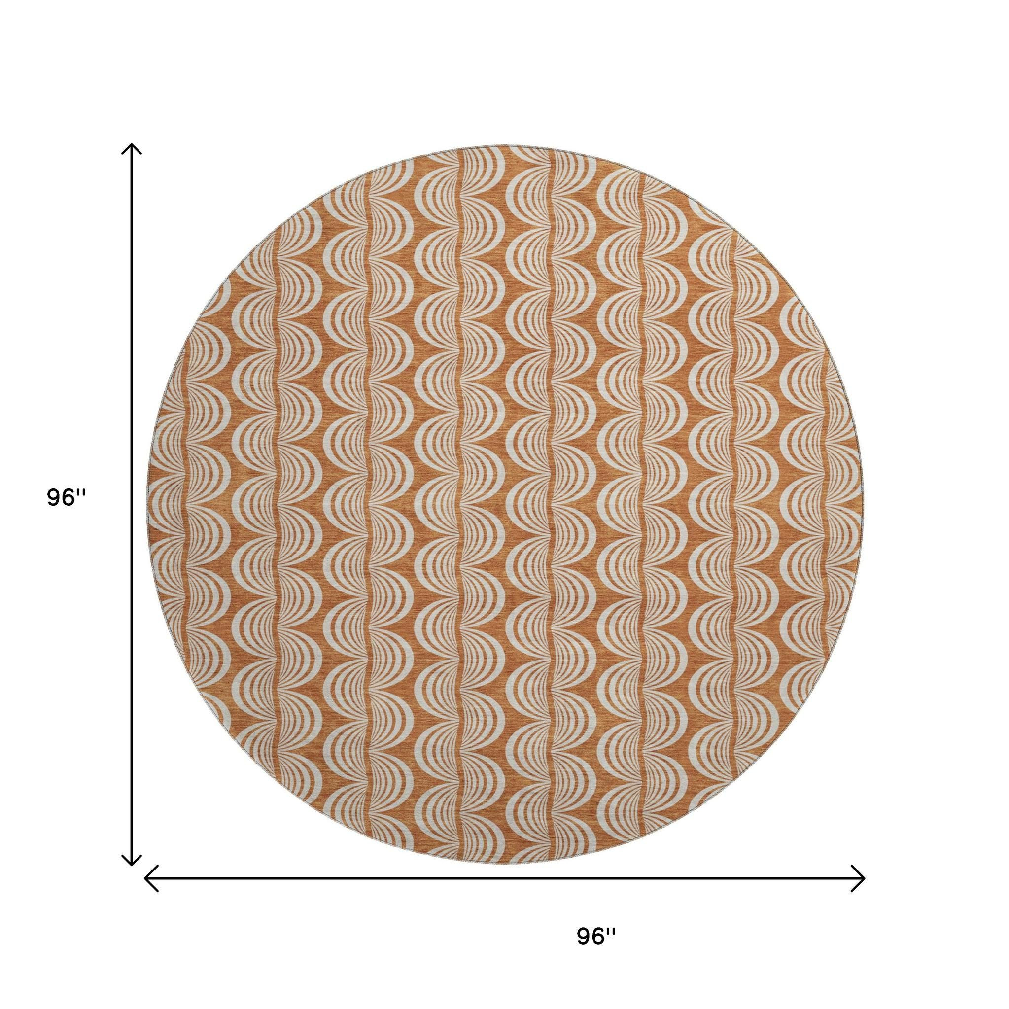 Add great coloration and comfortable texture to your space with this 8-foot rust and beige ogee washable round rug with uv protection. Ideal for spaces with kids and pets, this rug is stain resistant to help repel dirt and spilled liquids. Built to last, this rug crafted from polyester fibers is known for its durability and long lasting appeal. Rugs are a great way to showcase your style, hide imperfections, warm your home and reduce noise. This larger sized, transitional styled rug is ready to create a focal point or statement piece in your room. 96.00-inch h x 96.00-inch w x 0.39-inch d.