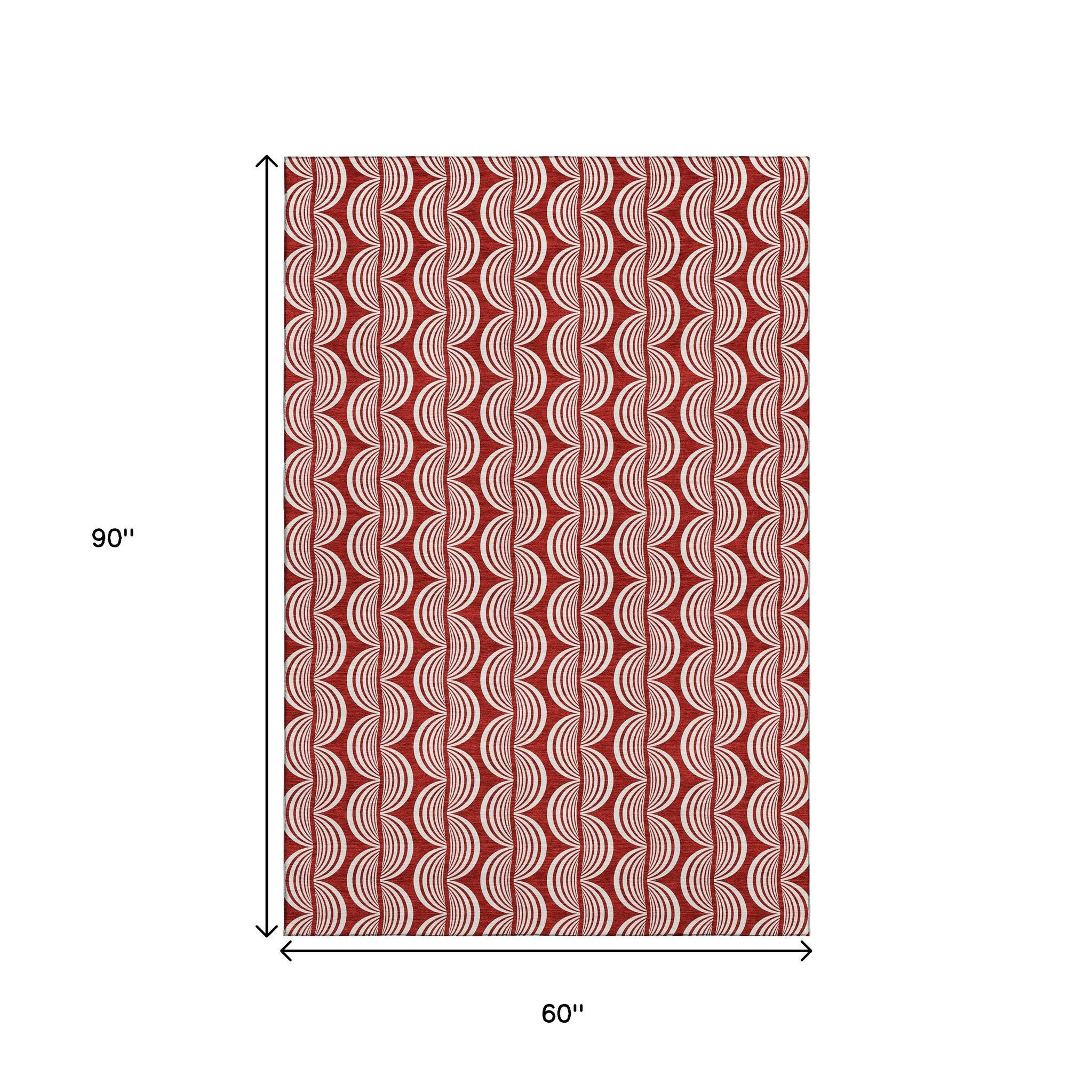 Set an inviting tone in your space with this 5-foot x 8-foot red and ivory ogee washable area rug with uv protection. Ideal for spaces with kids and pets, this rug is stain resistant to help repel dirt and spilled liquids. Built to last, this rug crafted from polyester fibers is known for its durability and long lasting appeal. Rugs are a great way to showcase your style, hide imperfections, warm your home and reduce noise. This larger sized, transitional styled rug is ready to create a focal point or statement piece in your room. 60.00-inch h x 90.00-inch w x 0.39-inch d.
