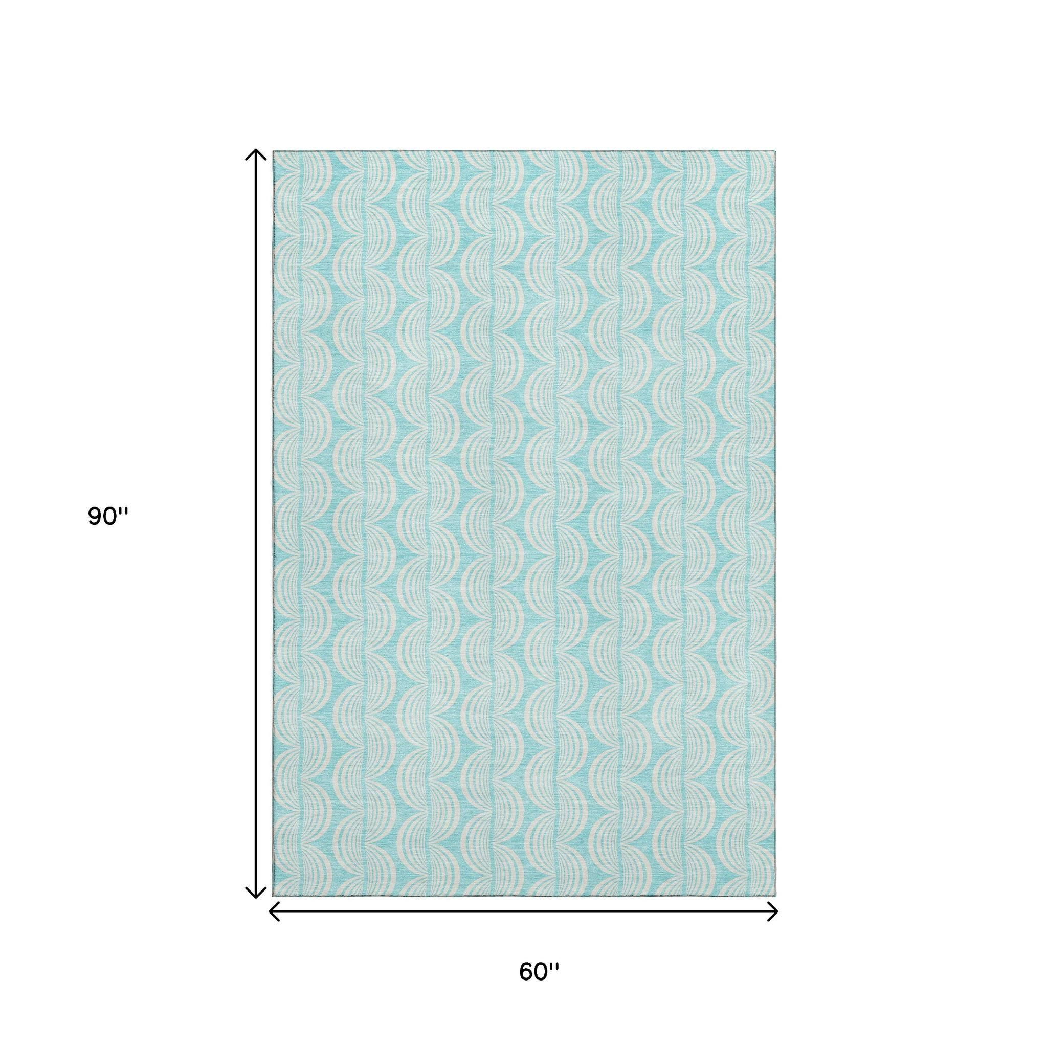 Add some artistry to your room with this 5-foot x 8-foot aqua and ivory ogee washable area rug with uv protection. Ideal for spaces with kids and pets, this rug is stain resistant to help repel dirt and spilled liquids. Built to last, this rug crafted from polyester fibers is known for its durability and long lasting appeal. Rugs are a great way to showcase your style, hide imperfections, warm your home and reduce noise. This larger sized, transitional styled rug is ready to create a focal point or statement piece in your room. 60.00-inch h x 90.00-inch w x 0.39-inch d.