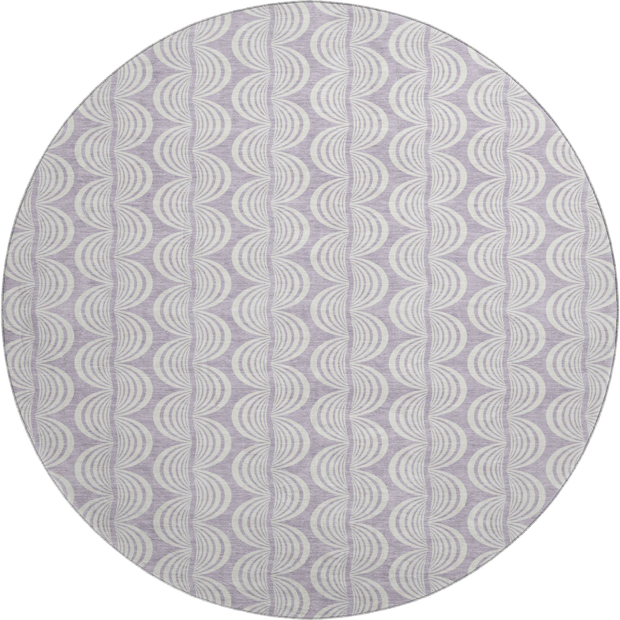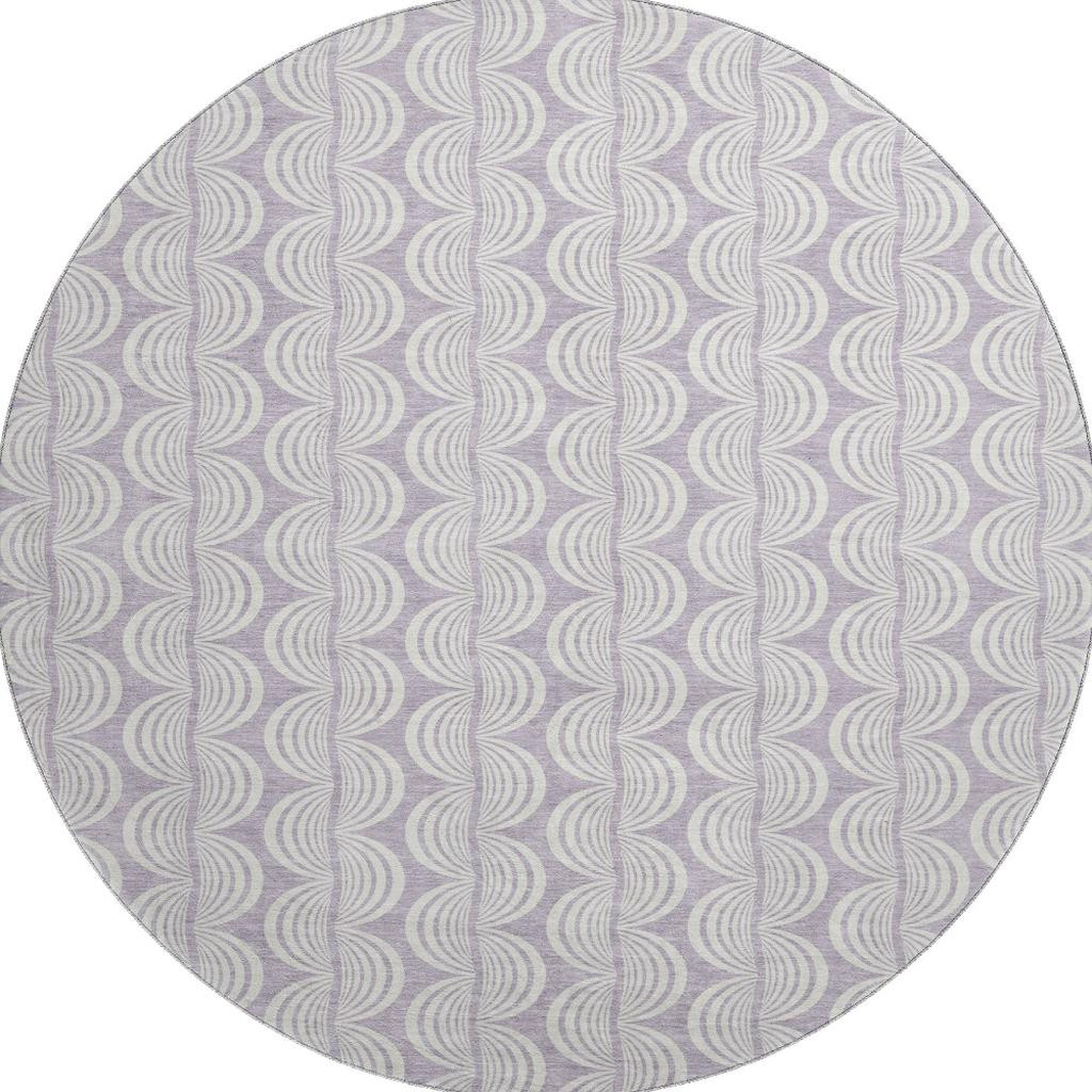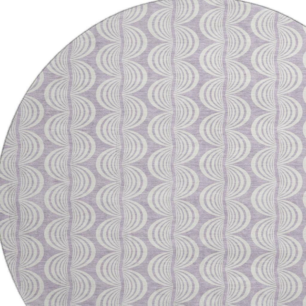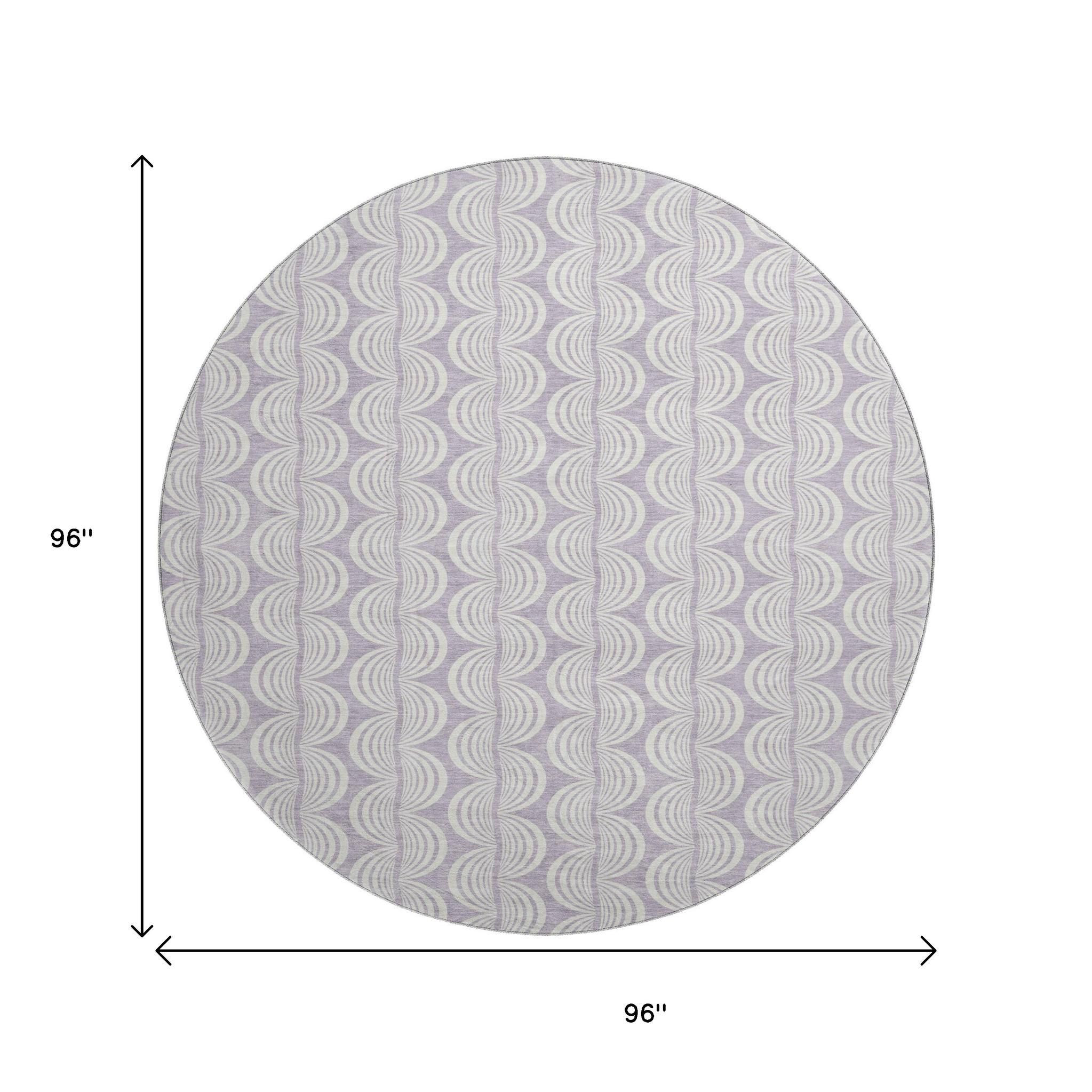 Add great coloration and comfortable texture to your space with this 8-foot lavender and ivory ogee washable round rug with uv protection. Ideal for spaces with kids and pets, this rug is stain resistant to help repel dirt and spilled liquids. Built to last, this rug crafted from polyester fibers is known for its durability and long lasting appeal. Rugs are a great way to showcase your style, hide imperfections, warm your home and reduce noise. This larger sized, transitional styled rug is ready to create a focal point or statement piece in your room. 96.00-inch h x 96.00-inch w x 0.39-inch d.