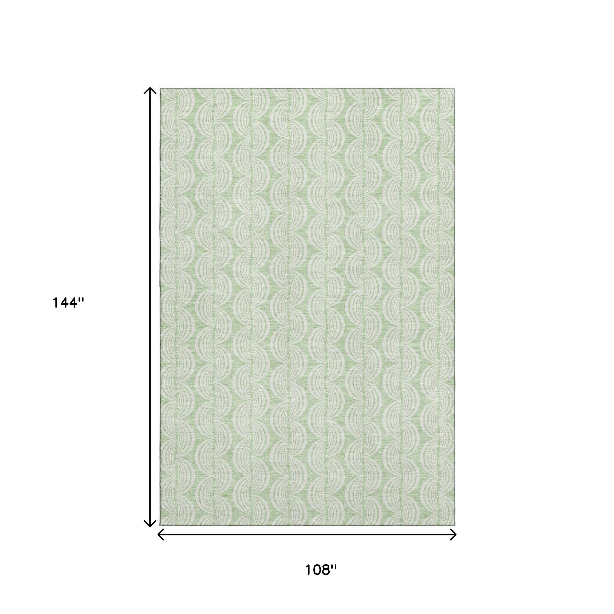 Add great coloration and comfortable texture to your space with this 9-foot x 12-foot mint green and ivory ogee washable area rug with uv protection. Ideal for spaces with kids and pets, this rug is stain resistant to help repel dirt and spilled liquids. Built to last, this rug crafted from polyester fibers is known for its durability and long lasting appeal. Rugs are a great way to showcase your style, hide imperfections, warm your home and reduce noise. This larger sized, transitional styled rug is ready to create a focal point or statement piece in your room. 108.00-inch h x 144.00-inch w x 0.39-inch d.