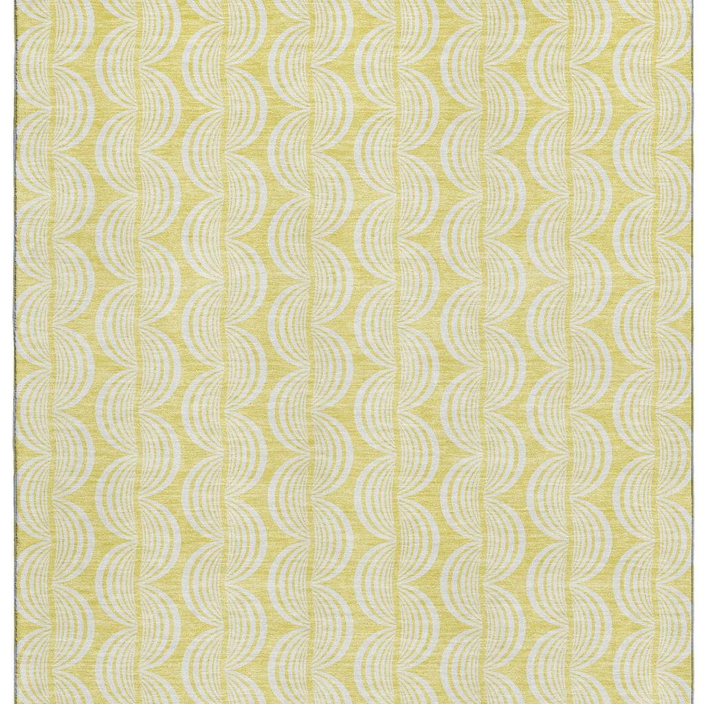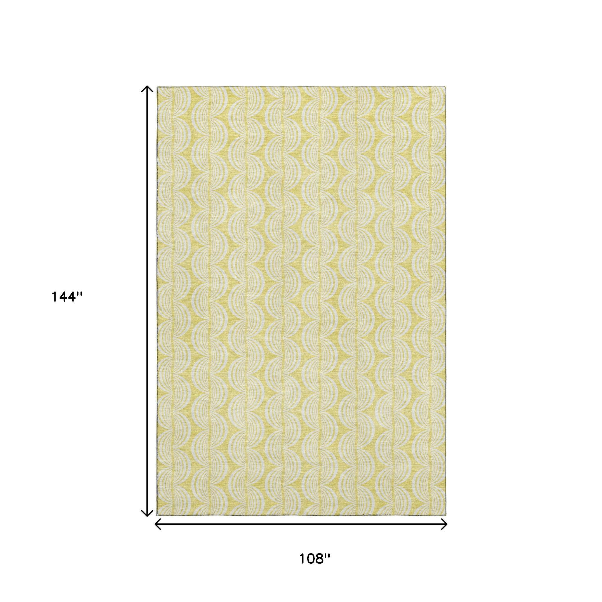 This 9-foot x 12-foot yellow and ivory ogee washable area rug with uv protection, is a great way to add warmth to a room. Ideal for spaces with kids and pets, this rug is stain resistant to help repel dirt and spilled liquids. Built to last, this rug crafted from polyester fibers is known for its durability and long lasting appeal. Rugs are a great way to showcase your style, hide imperfections, warm your home and reduce noise. This larger sized, transitional styled rug is ready to create a focal point or statement piece in your room. 108.00-inch h x 144.00-inch w x 0.39-inch d.