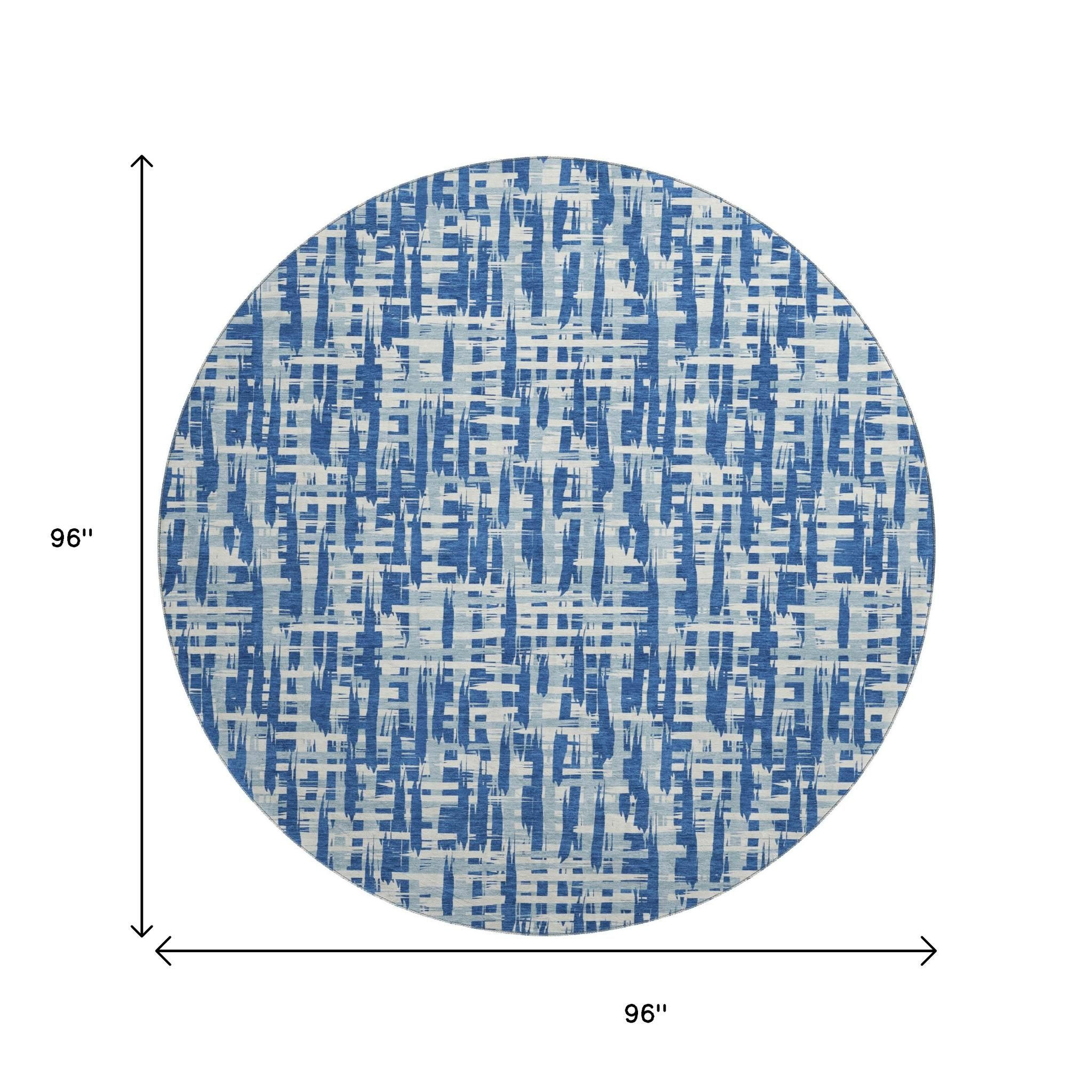 Set an inviting tone in your space with this 8-foot blue denim blue and ivory abstract geometric washable round rug with uv protection. Ideal for spaces with kids and pets, this rug is stain resistant to help repel dirt and spilled liquids. Built to last, this rug crafted from polyester fibers is known for its durability and long lasting appeal. Rugs are a great way to showcase your style, hide imperfections, warm your home and reduce noise. This larger sized, transitional styled rug is ready to create a focal point or statement piece in your room. 96.00-inch h x 96.00-inch w x 0.39-inch d.